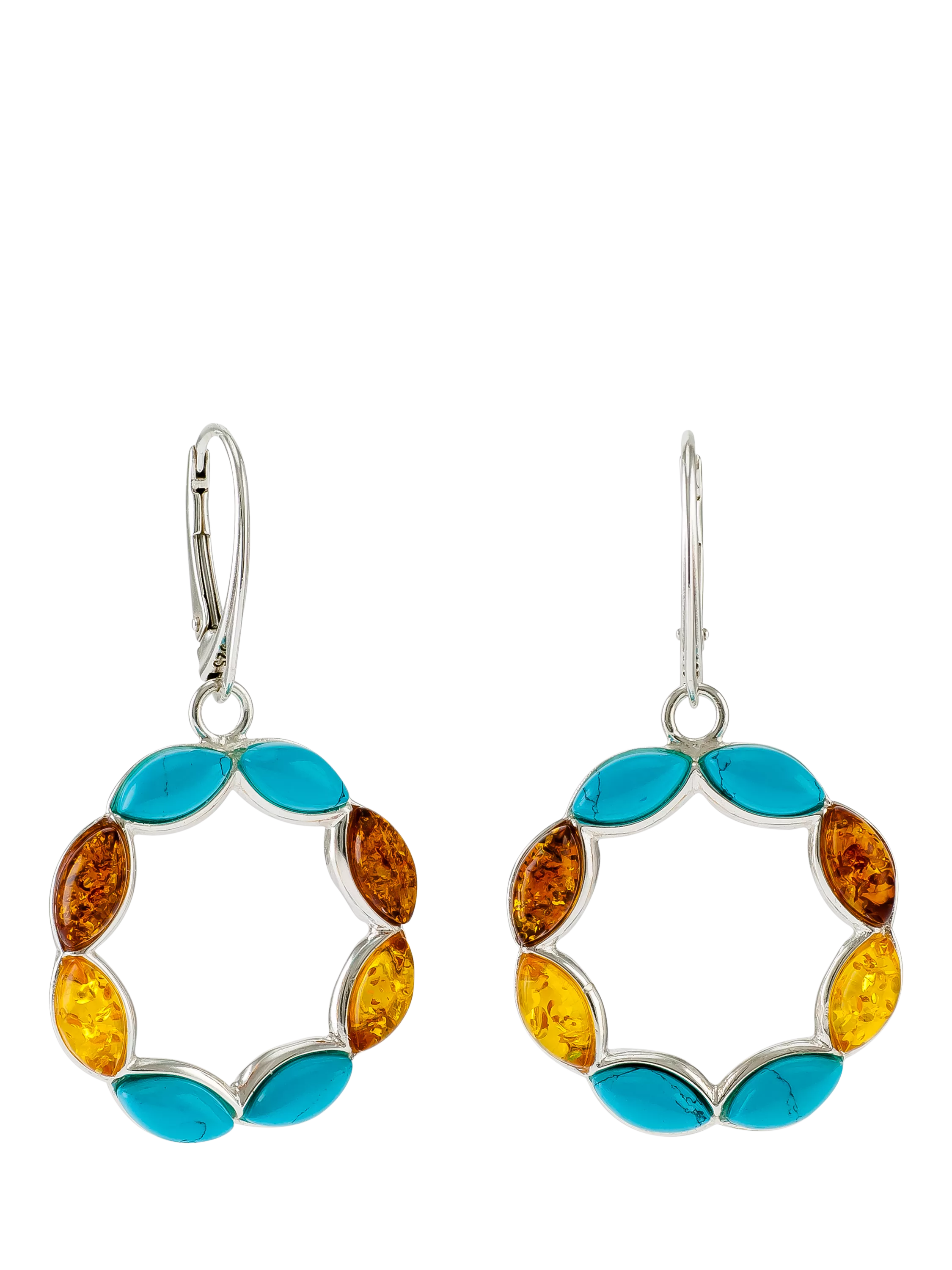 With a bold circle drop, the earrings make natural amber and turquoise stones contrast beautifully. The earrings are made for pierced ears only and will be suitable for wearing with other amber jewellery.