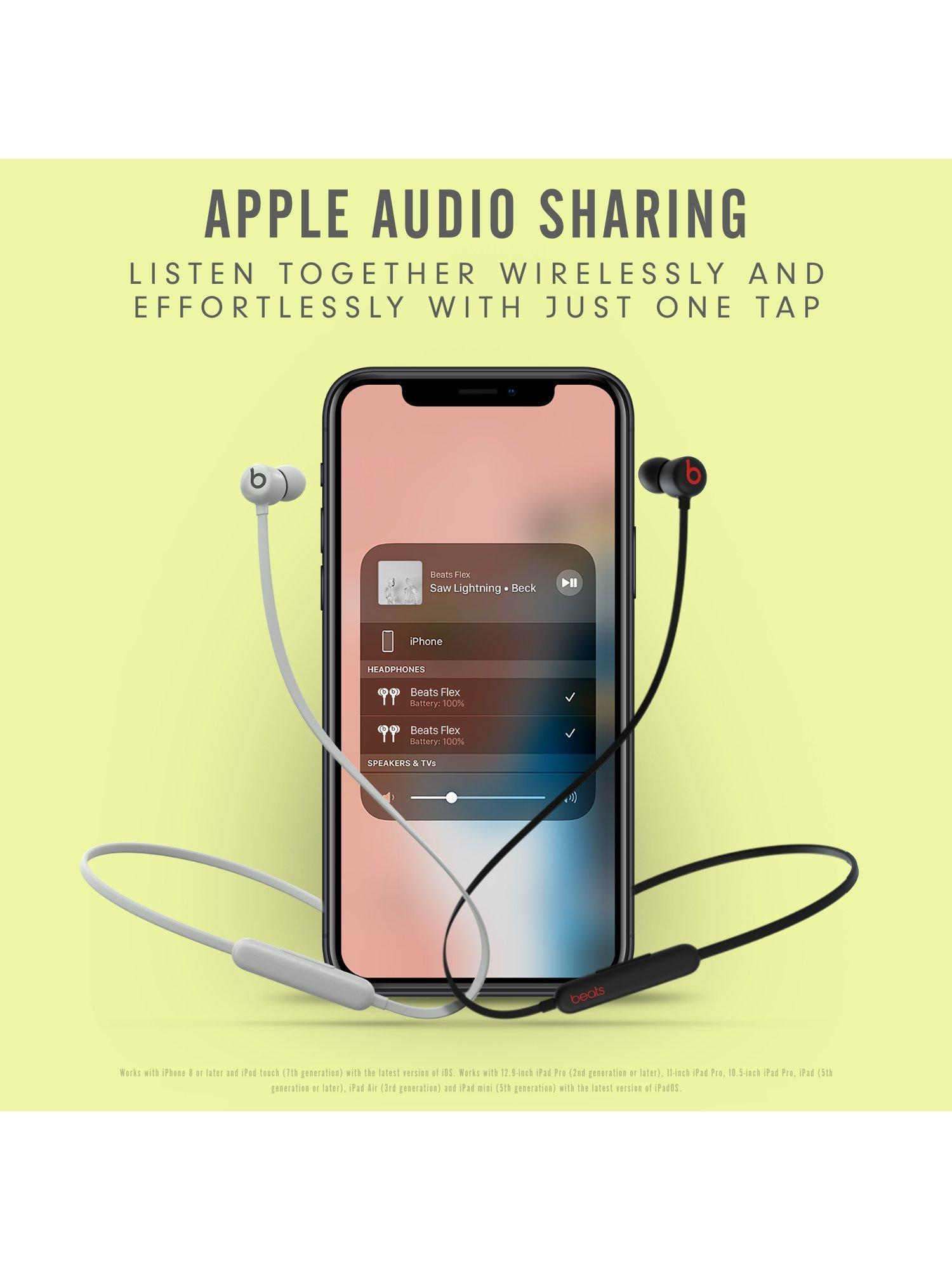 The Apple W1 chip can integrate the Beats Flex with any other Apple products you may have, so you can seamlessly switch between devices that are synced to iCloud (requires iCloud account and macOS Sierra, iOS 10, watchOS 3 or later versions). And you can use one-tap Audio Sharing to sync with other selected compatible Beats headphones or Apple AirPods, to wirelessly share what you’re listening to with others.