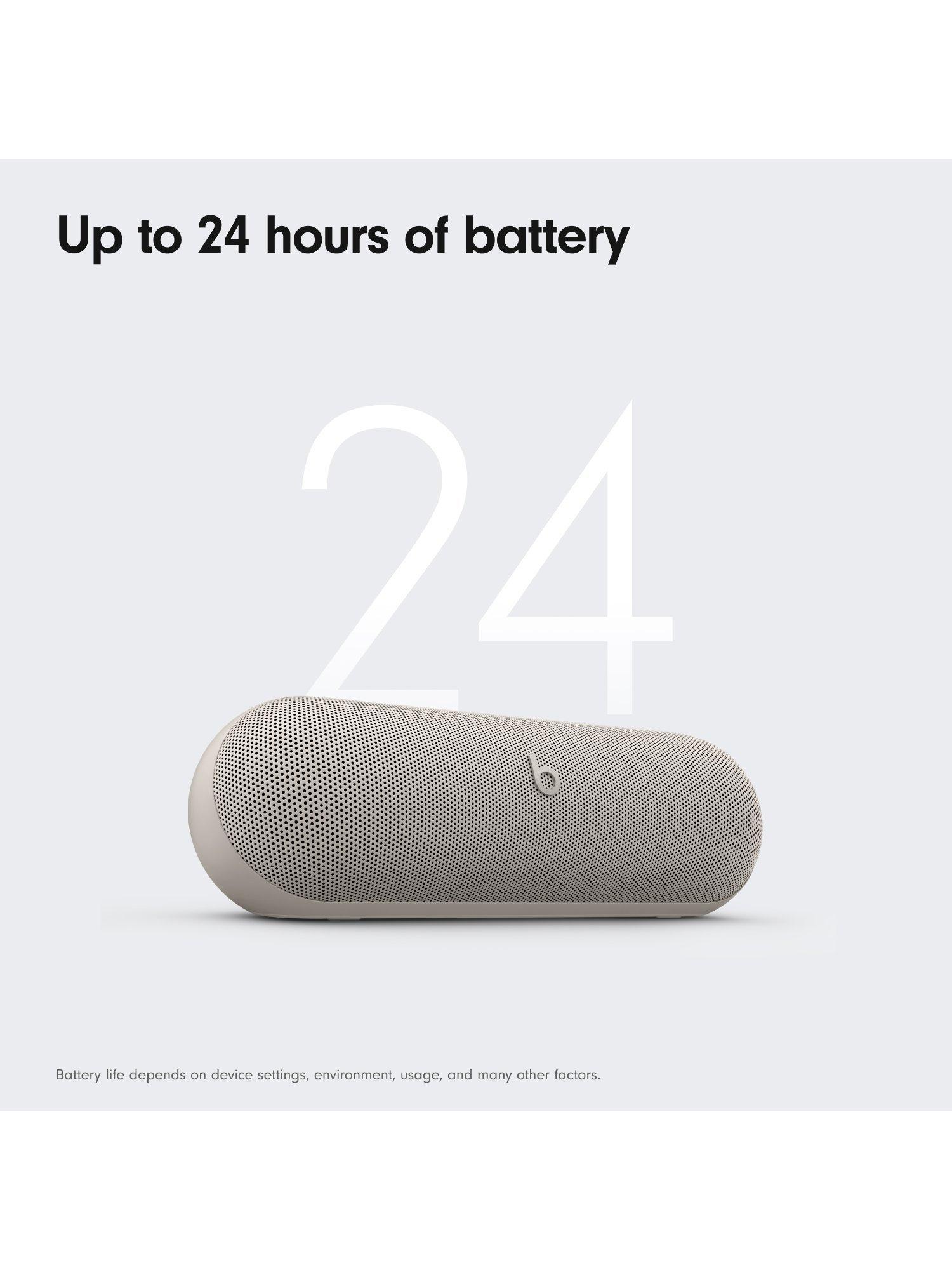 *** Testing conducted by Apple in April 2024 using pre-production Beats Pill units and software paired with iPhone 15 Pro units and pre-release software. The playlist consisted of 358 unique audio tracks purchased from the iTunes Store (256Kbps AAC encoding). Volume was set to 50%. Testing consisted of full Beats Pill battery discharge while playing audio until Beats Pill stopped playback. Battery life depends on device settings, environment, usage and many other factors.