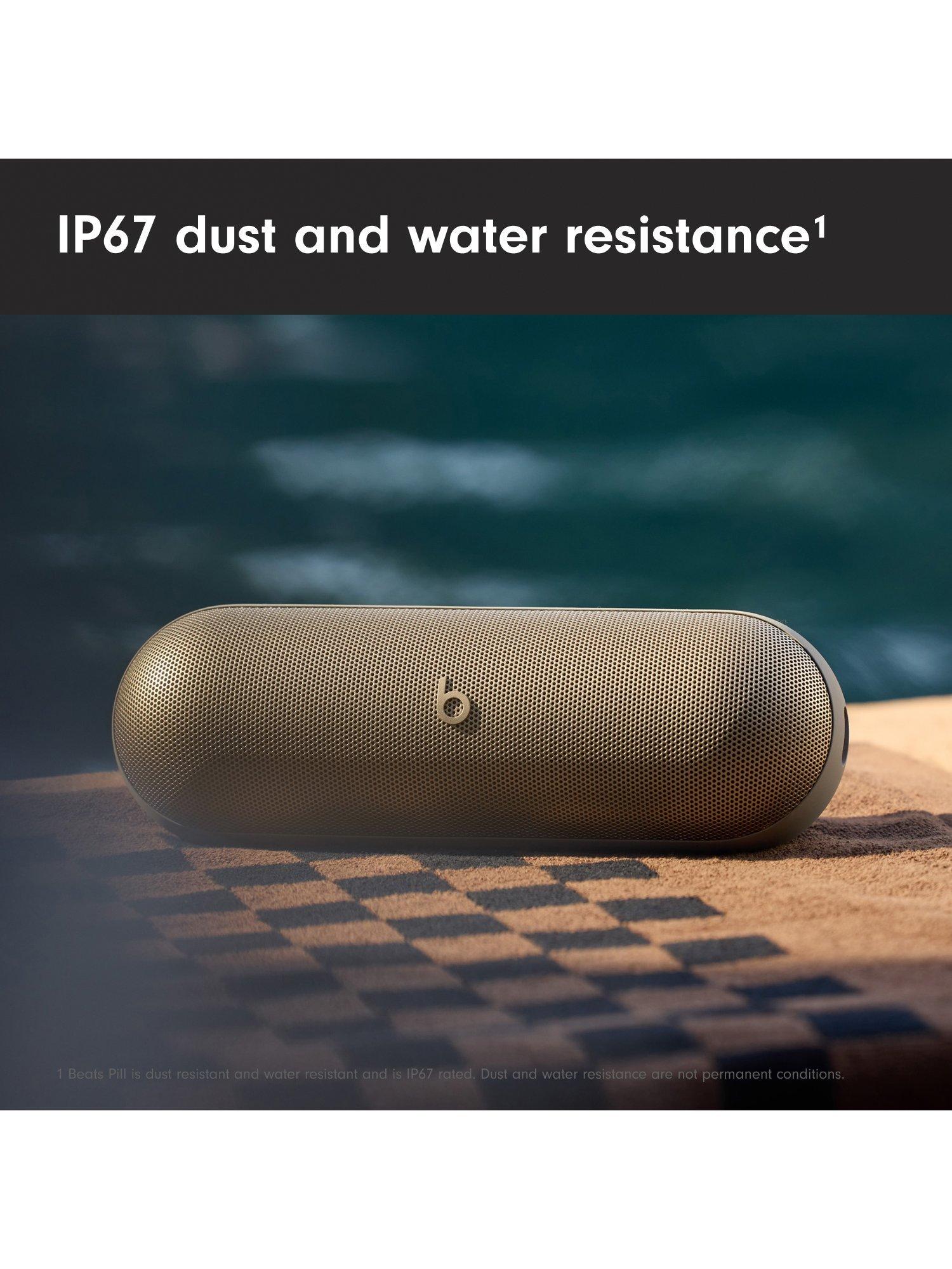 ** Beats Pill is dust resistant and water resistant, providing protection from sand intrusion, water and other sources of ingress when used indoors and outdoors. Beats Pill was tested under controlled laboratory conditions, and has a rating of IP67 under IEC standard 60529. Dust and water resistance are not permanent conditions and might decrease as a result of normal wear. Do not attempt to charge Beats Pill when wet.