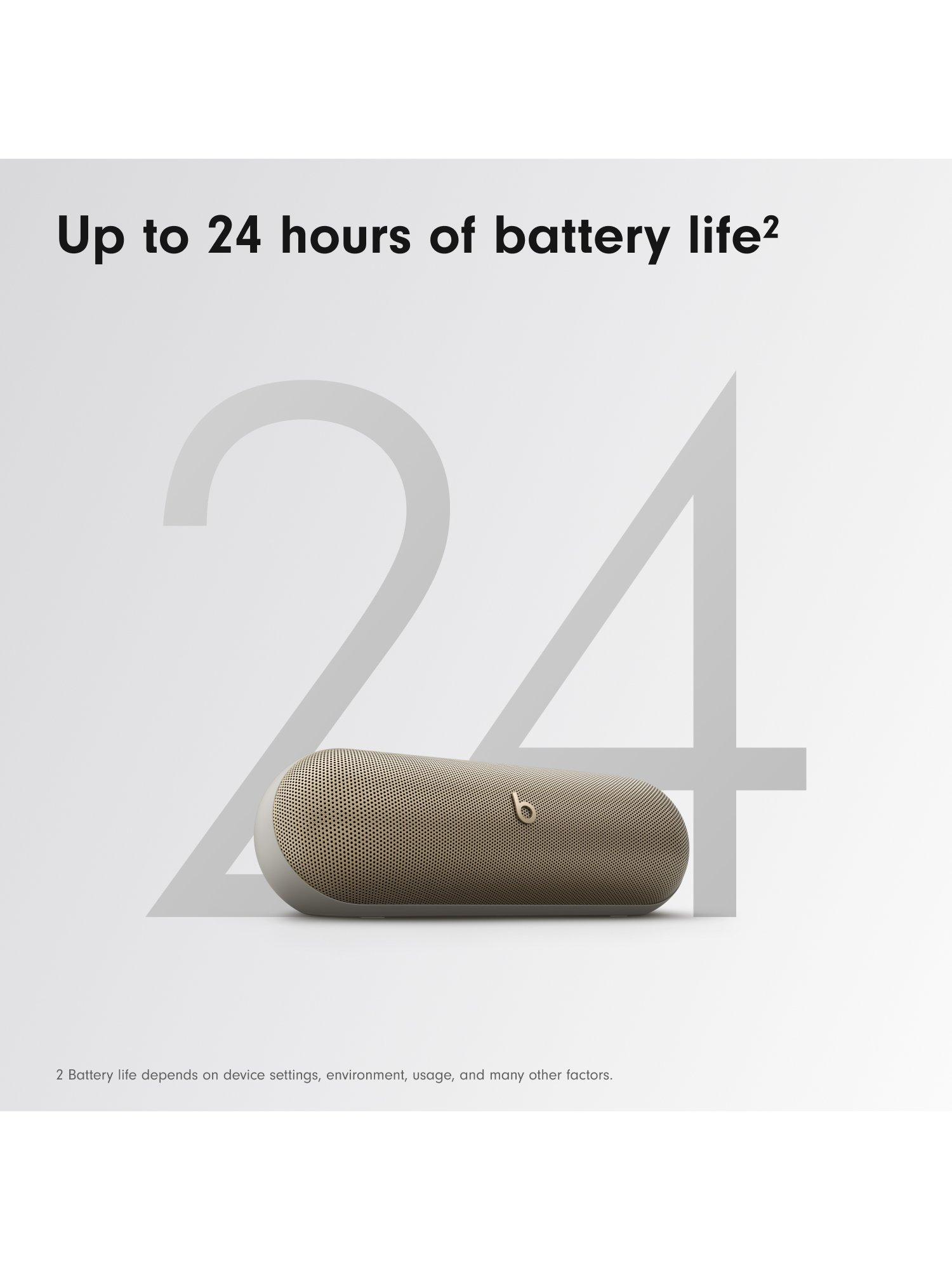 *** Testing conducted by Apple in April 2024 using pre-production Beats Pill units and software paired with iPhone 15 Pro units and pre-release software. The playlist consisted of 358 unique audio tracks purchased from the iTunes Store (256Kbps AAC encoding). Volume was set to 50%. Testing consisted of full Beats Pill battery discharge while playing audio until Beats Pill stopped playback. Battery life depends on device settings, environment, usage and many other factors.