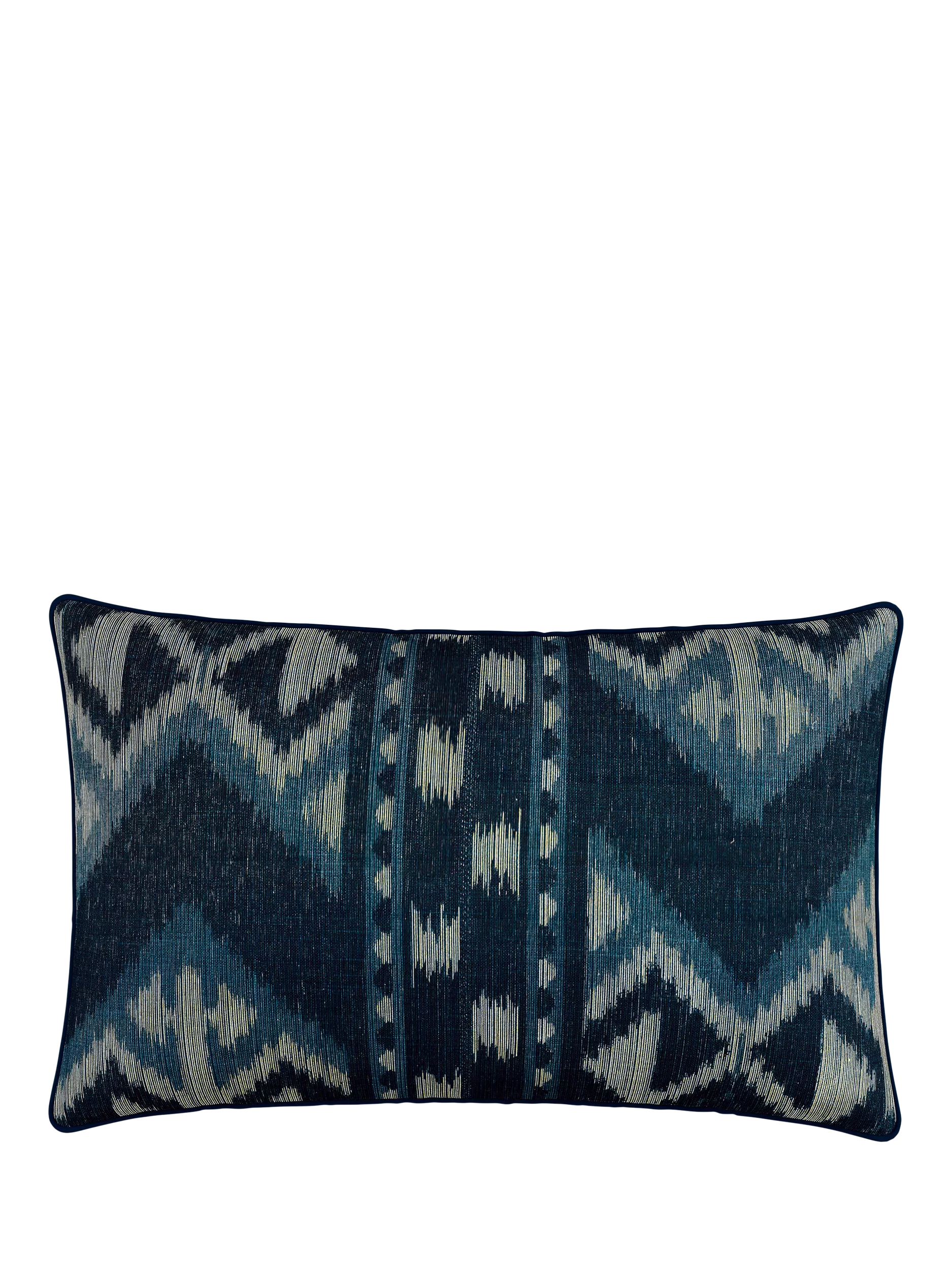 The Dhaka collection is inspired by antique rug patterns with a delicate painterly look all-over. This printed cushion has an ikat design and coordinating piped edge.