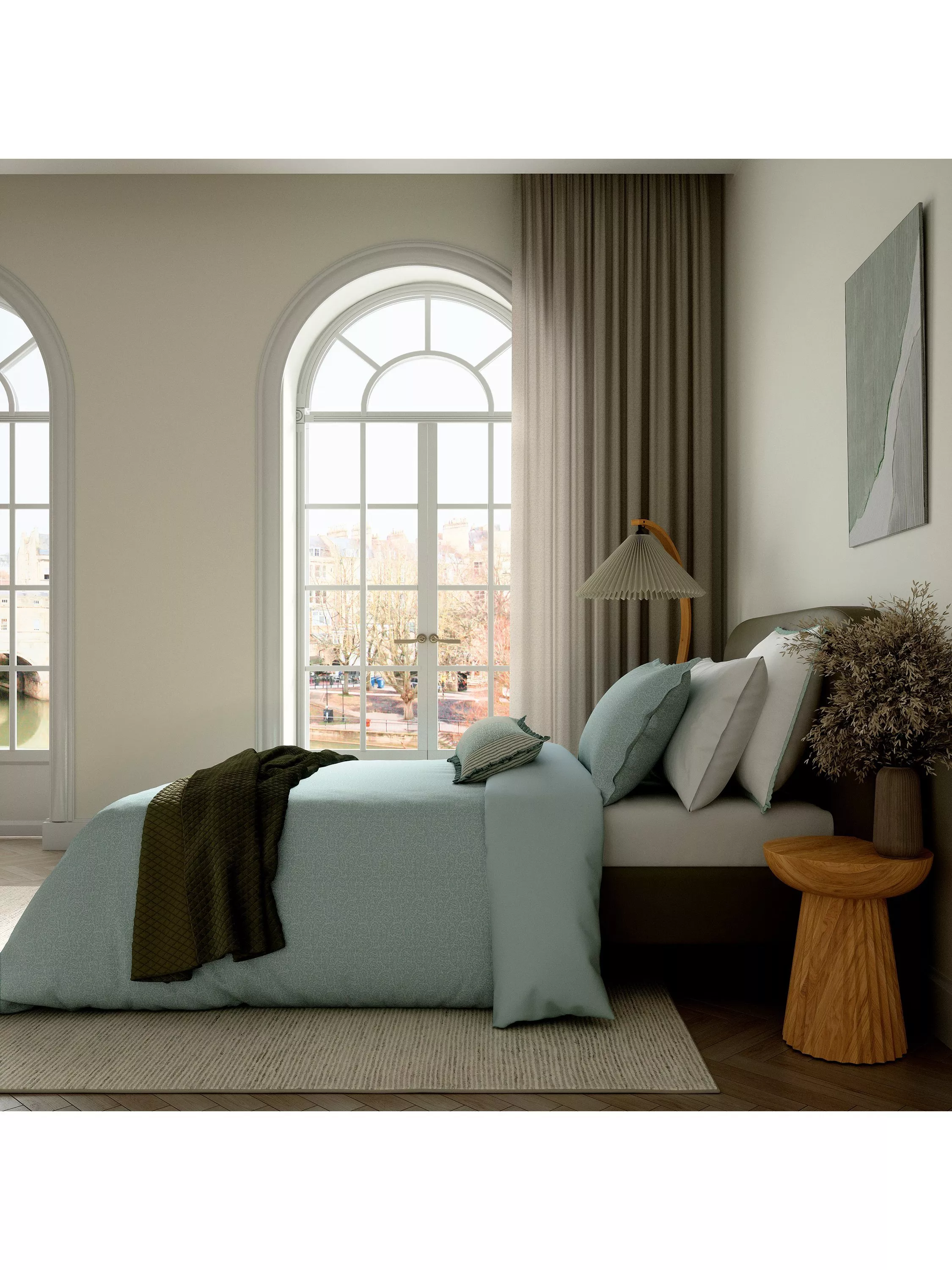 A modern take on a jacquard design with a finely woven paisley repeat all over. A beautifully intricate design with a plain dye reverse in cool cotton percale.