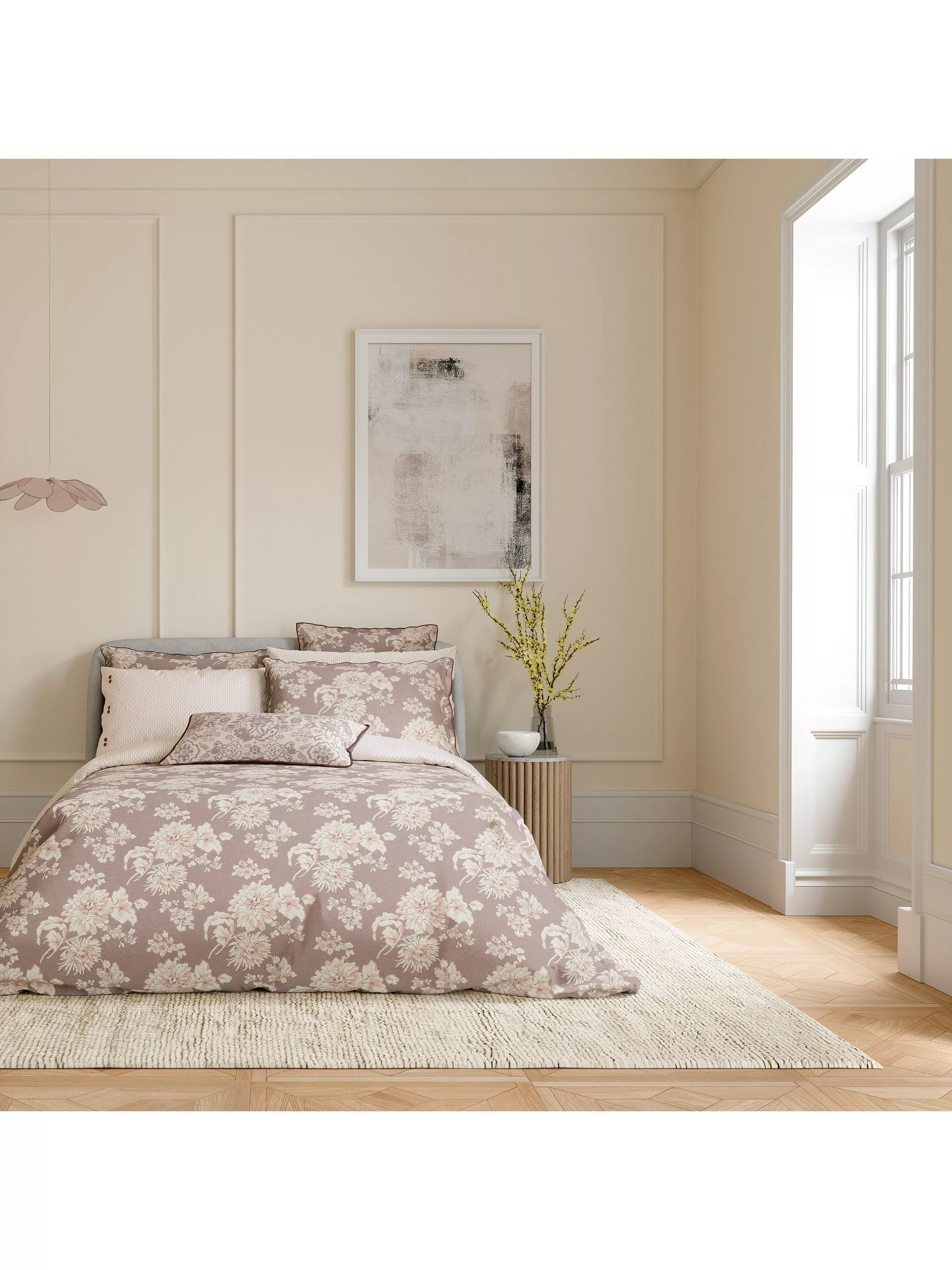 Beautifully feminine, Kassi presents a sophisticated all-over floral pattern in delicate dusky pink. The reverse pattern showcases a contemporary geo design all in crisp cool cotton percale.