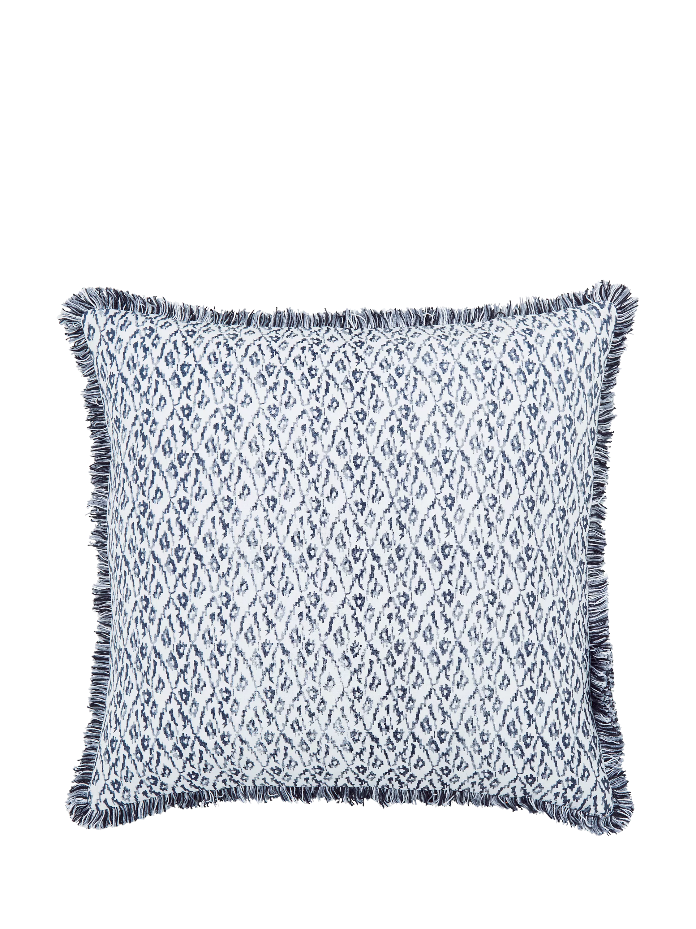 A flame stitch, patterned cushion made from a cotton and linen blend. Complete with a fringed border.