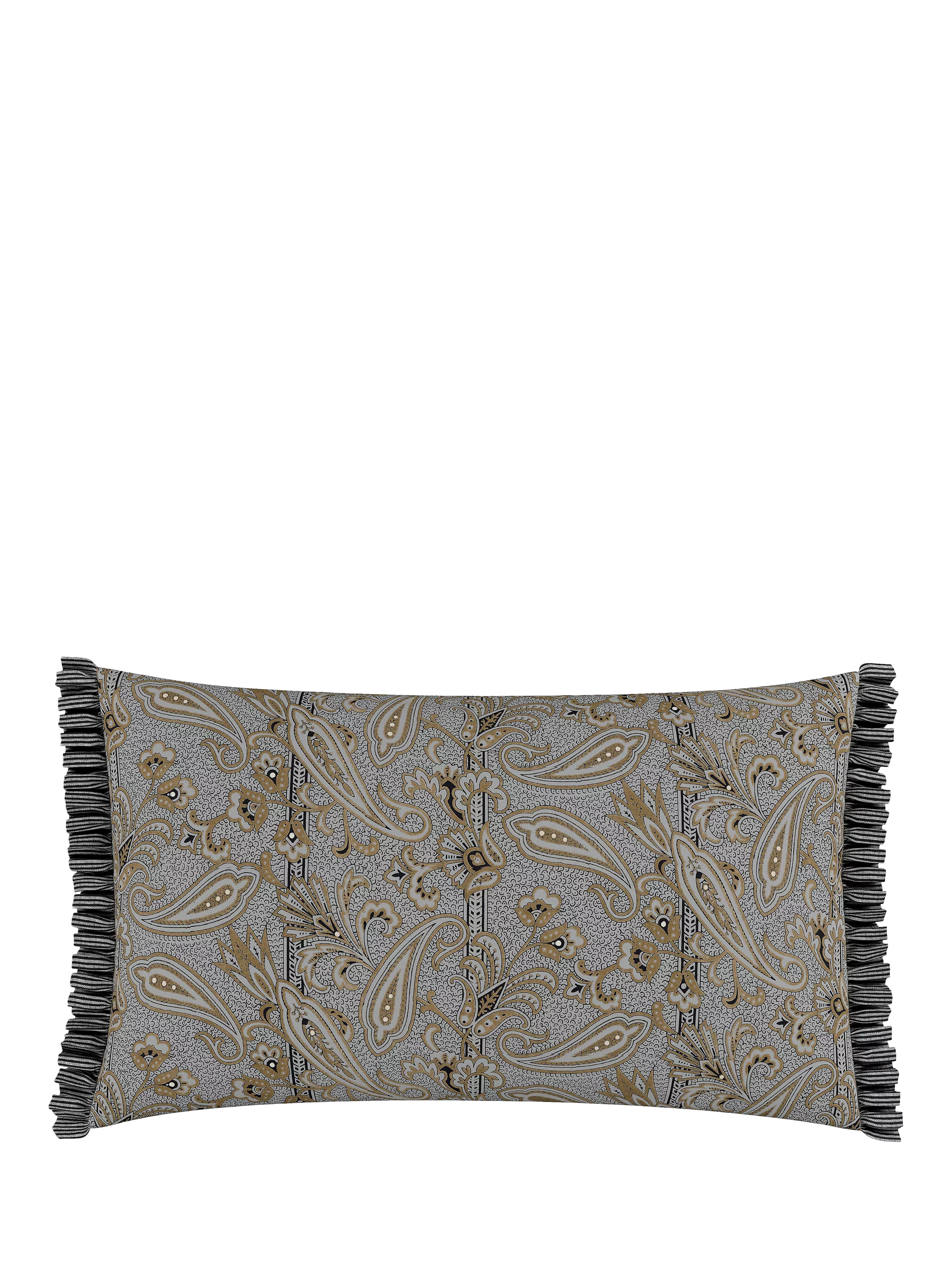 This cushion is designed in a timeless paisley print, with pleated detail on either edge.