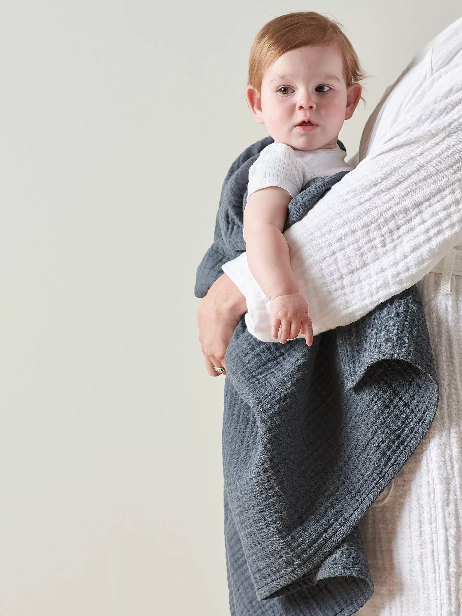 A super-soft 100% cotton baby blanket, with a gentle muslin finish that's perfect for delicate baby skin. An ideal multi-use blanket for the baby days; snuggling at home, nursing, an impromptu play or changing mat, a burp cloth, or on-the-go travel.