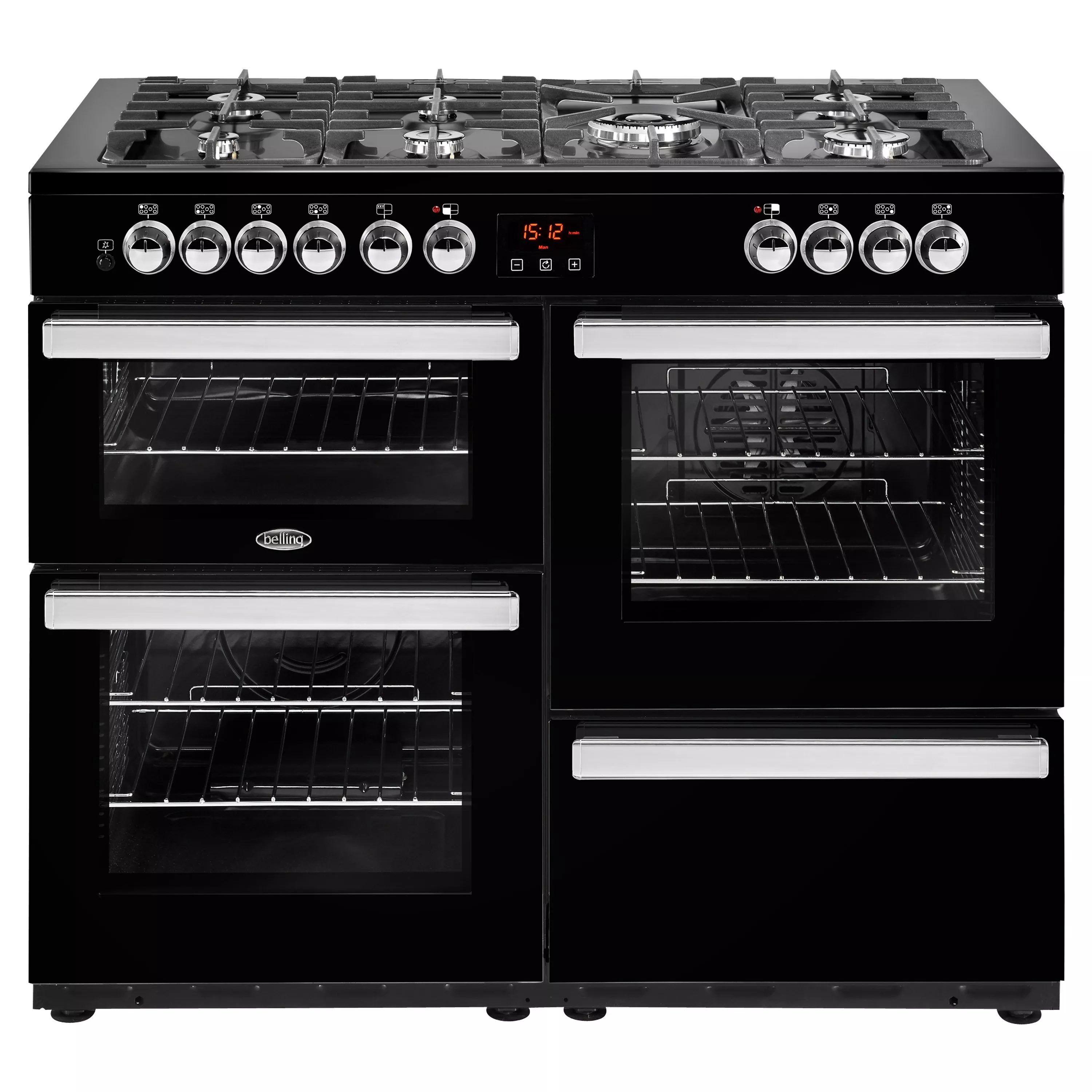 The Belling Cookcentre 110DFT Dual Fuel Range Cooker has been designed to produce professional cooking results. Made from quality materials in a stylish design this range cooker features two electric fan ovens, an electric grill and gas hob alongside a built in storage compartment. A LED touch control clock, programmer and simple rotary controls make operation straightforward.