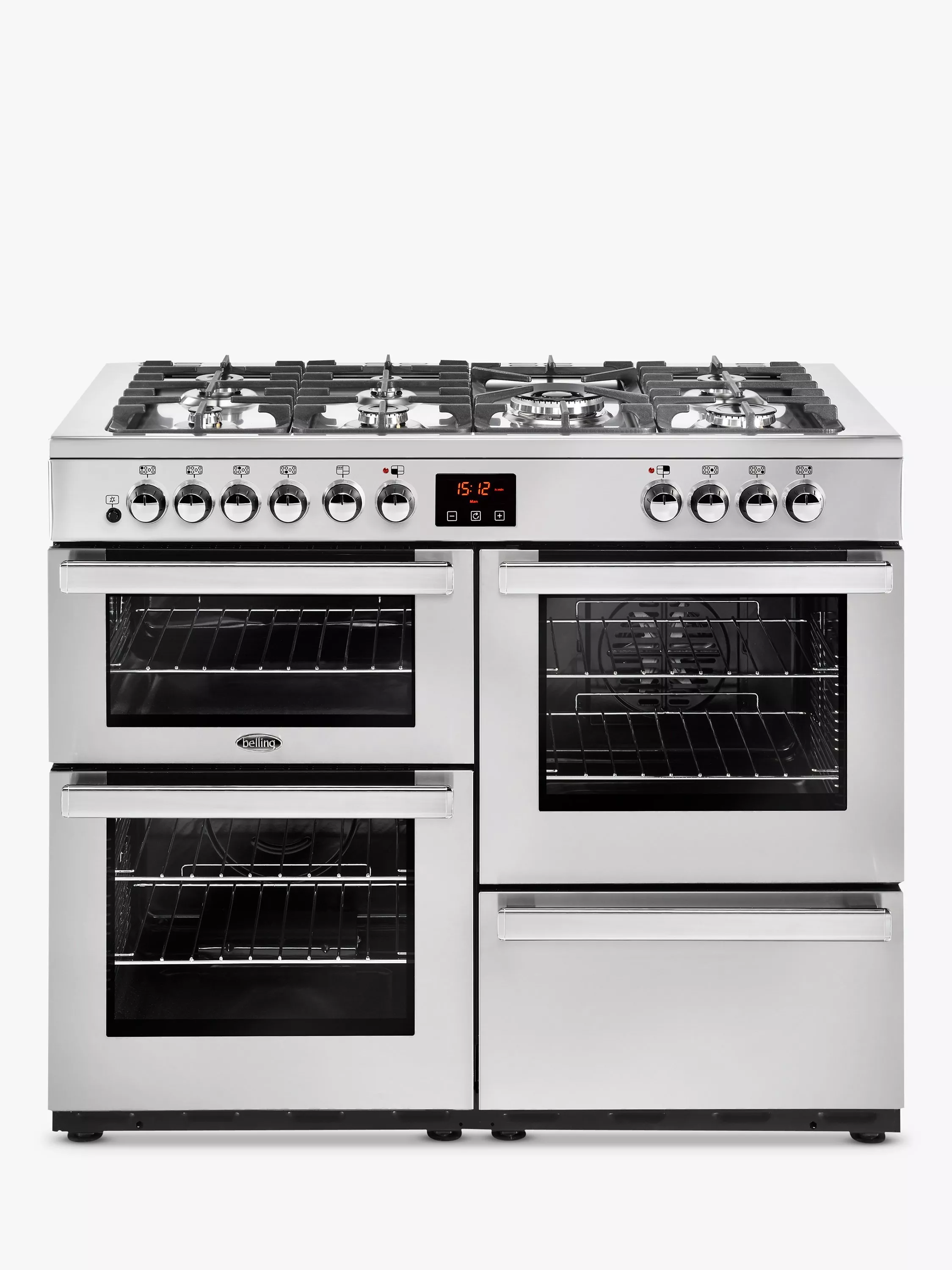 The Belling Cookcentre 110DFT Dual Fuel Range Cooker has been designed to produce professional cooking results. Made from quality materials in a stylish design this range cooker features two electric fan ovens, an electric grill and gas hob alongside a built in storage compartment. A LED touch control clock, programmer and simple rotary controls make operation straightforward.