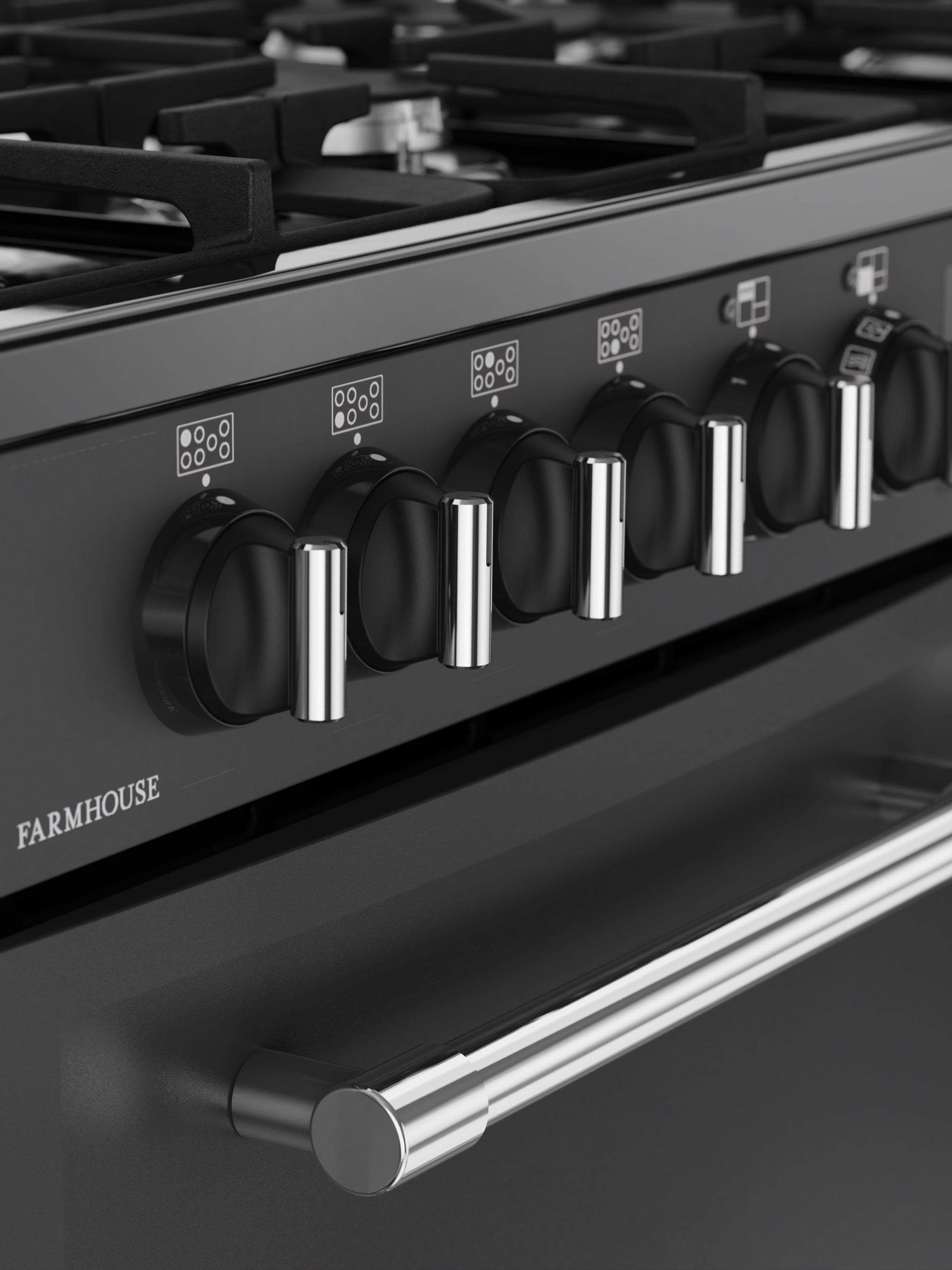 As a dual fuel model, this classic Farmhouse also combines the reliability of electric ovens with the control of a gas hob. There are seven burners in different sizes for all kinds of pans, including a powerful 4KW wok burner designed for dishes that need an intense blast of heat.