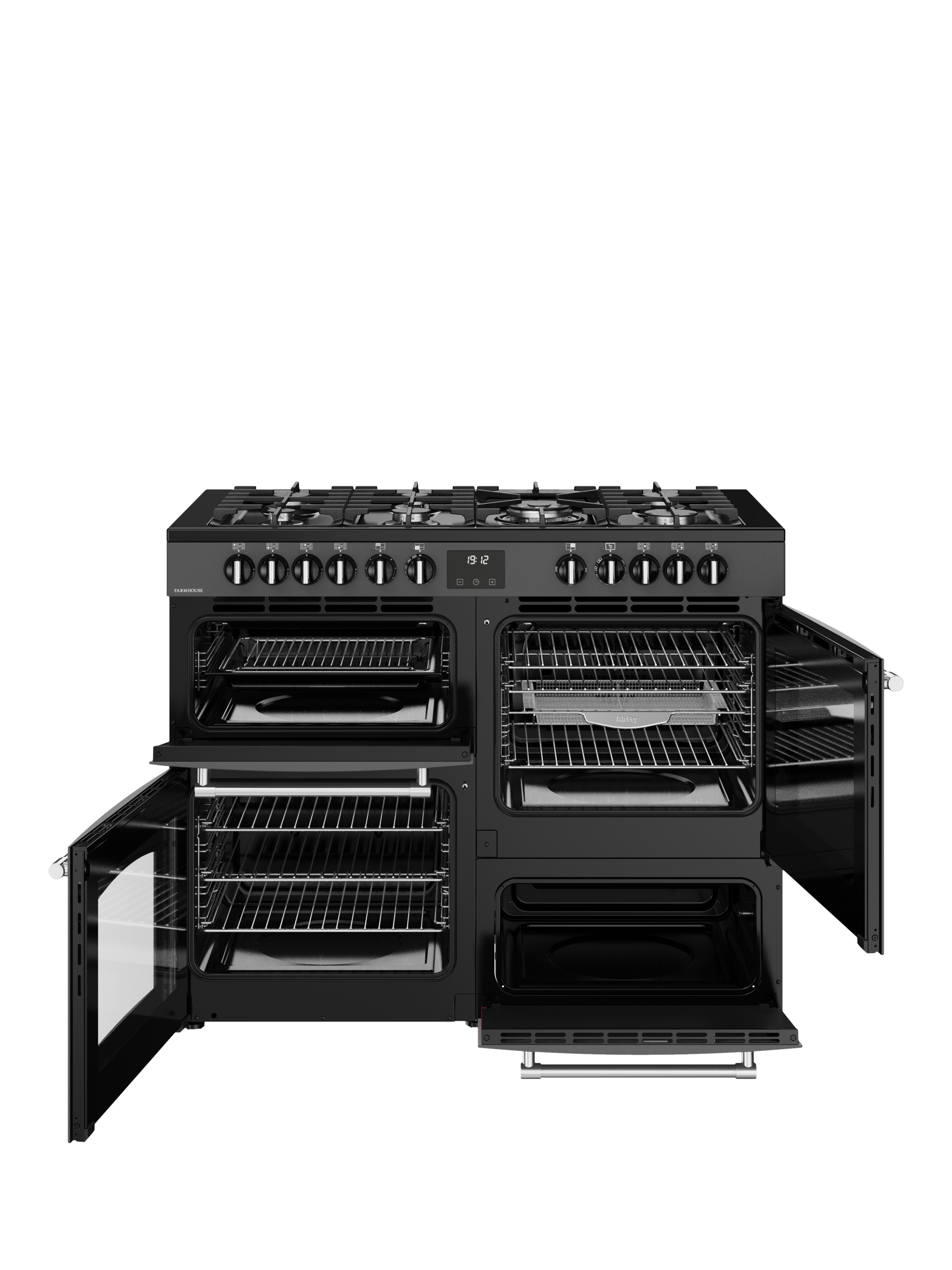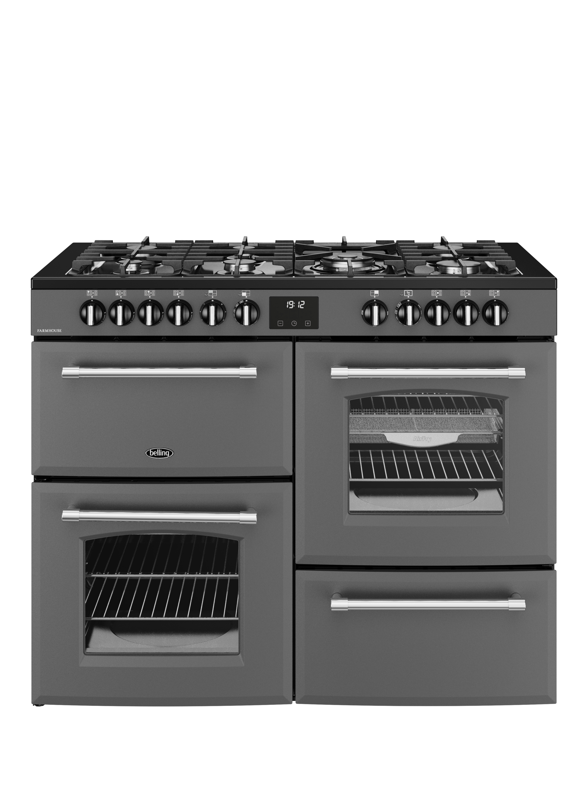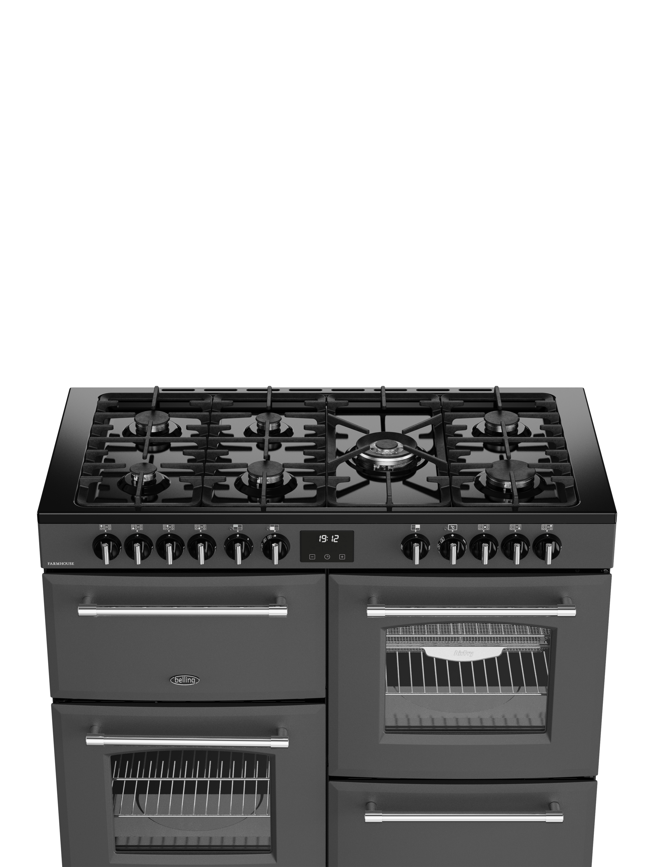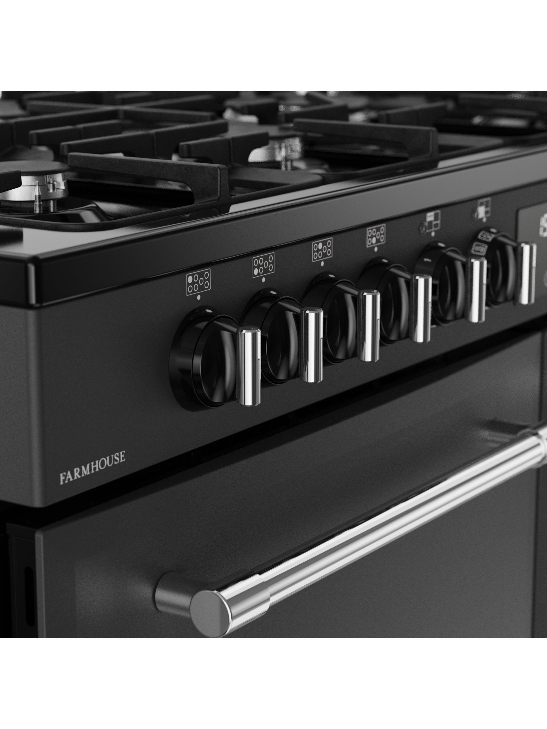 As a dual fuel model, this classic Farmhouse also combines the reliability of electric ovens with the control of a gas hob. There are seven burners in different sizes for all kinds of pans, including a powerful 4KW wok burner designed for dishes that need an intense blast of heat.