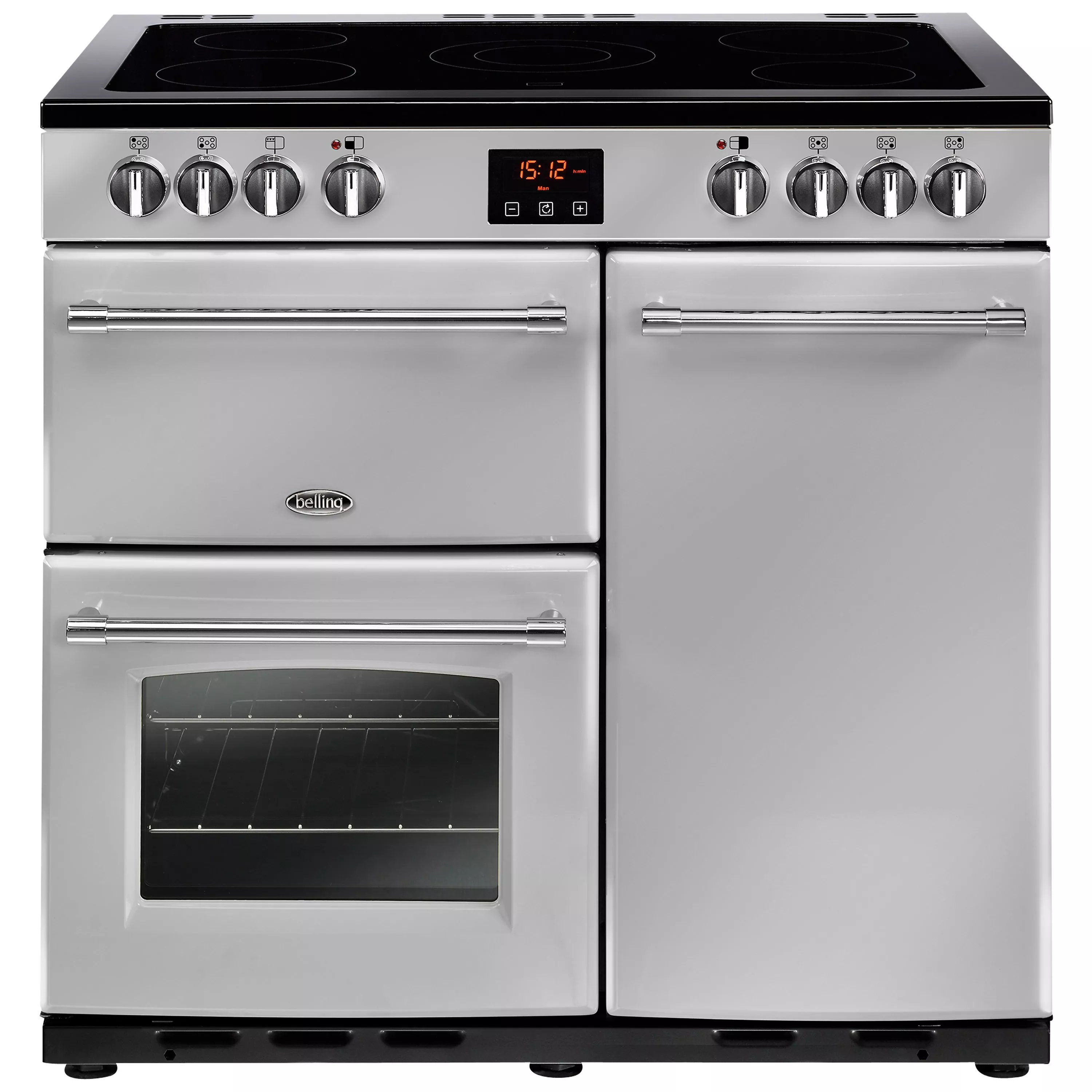 The Belling Farmhouse 90E Electric Range Cooker with ceramic hob has been designed to produce professional cooking results. Made from a quality stainless steel in a classic design, this range cooker features two electric ovens, a grill and ceramic hob. A LED touch control clock and simple rotary controls make operation straightforward while adding a stylish but practical design feature.