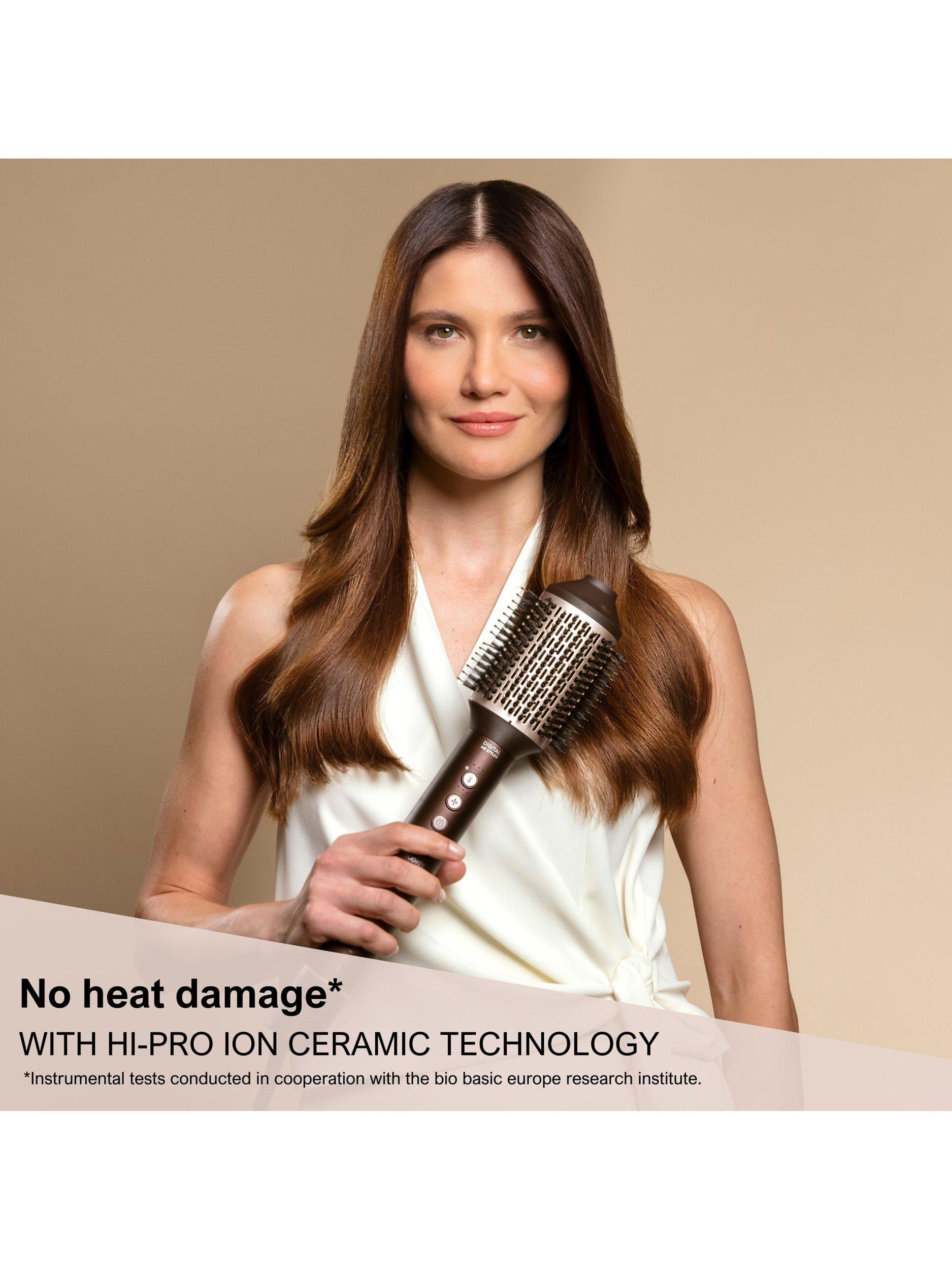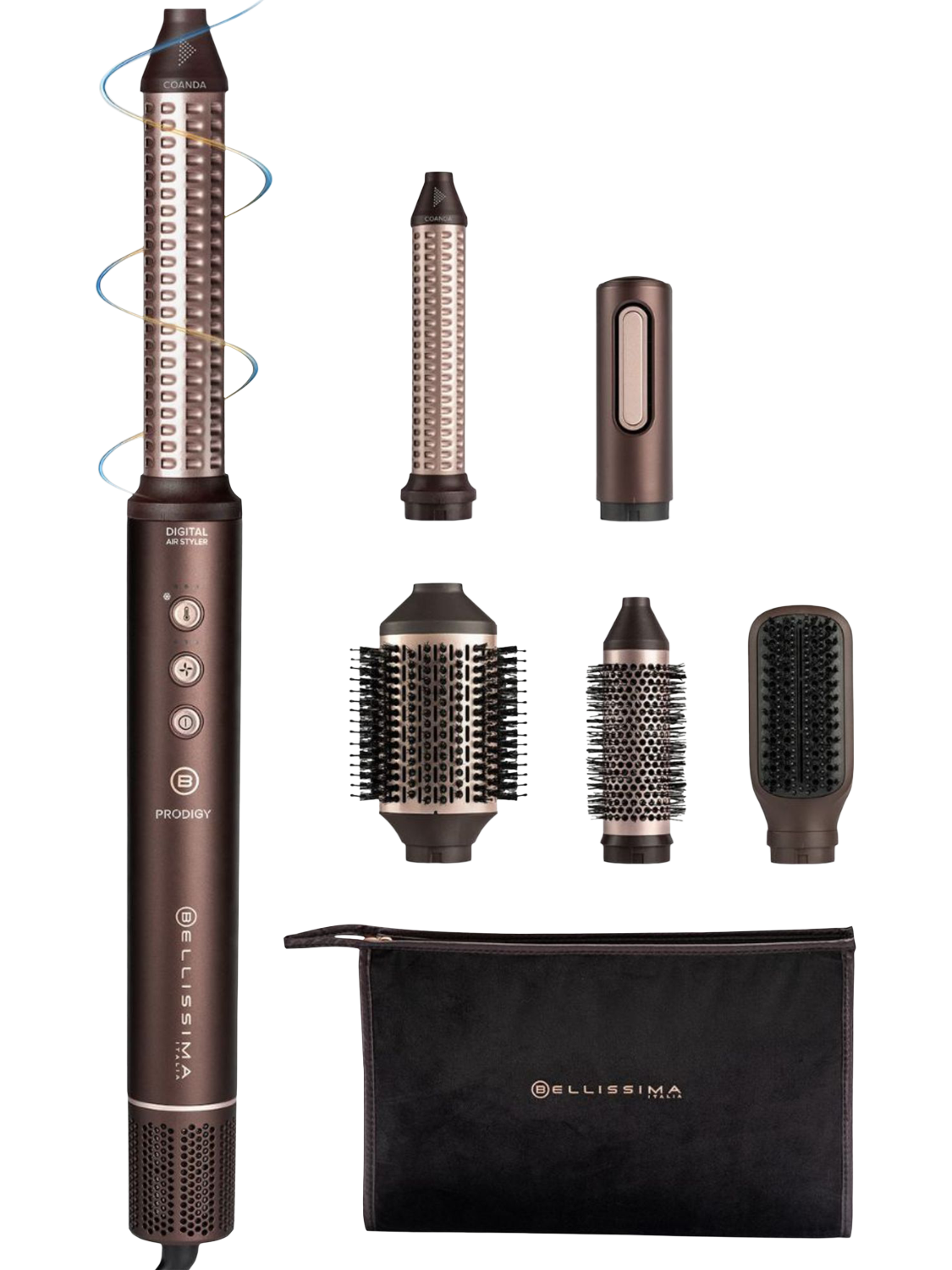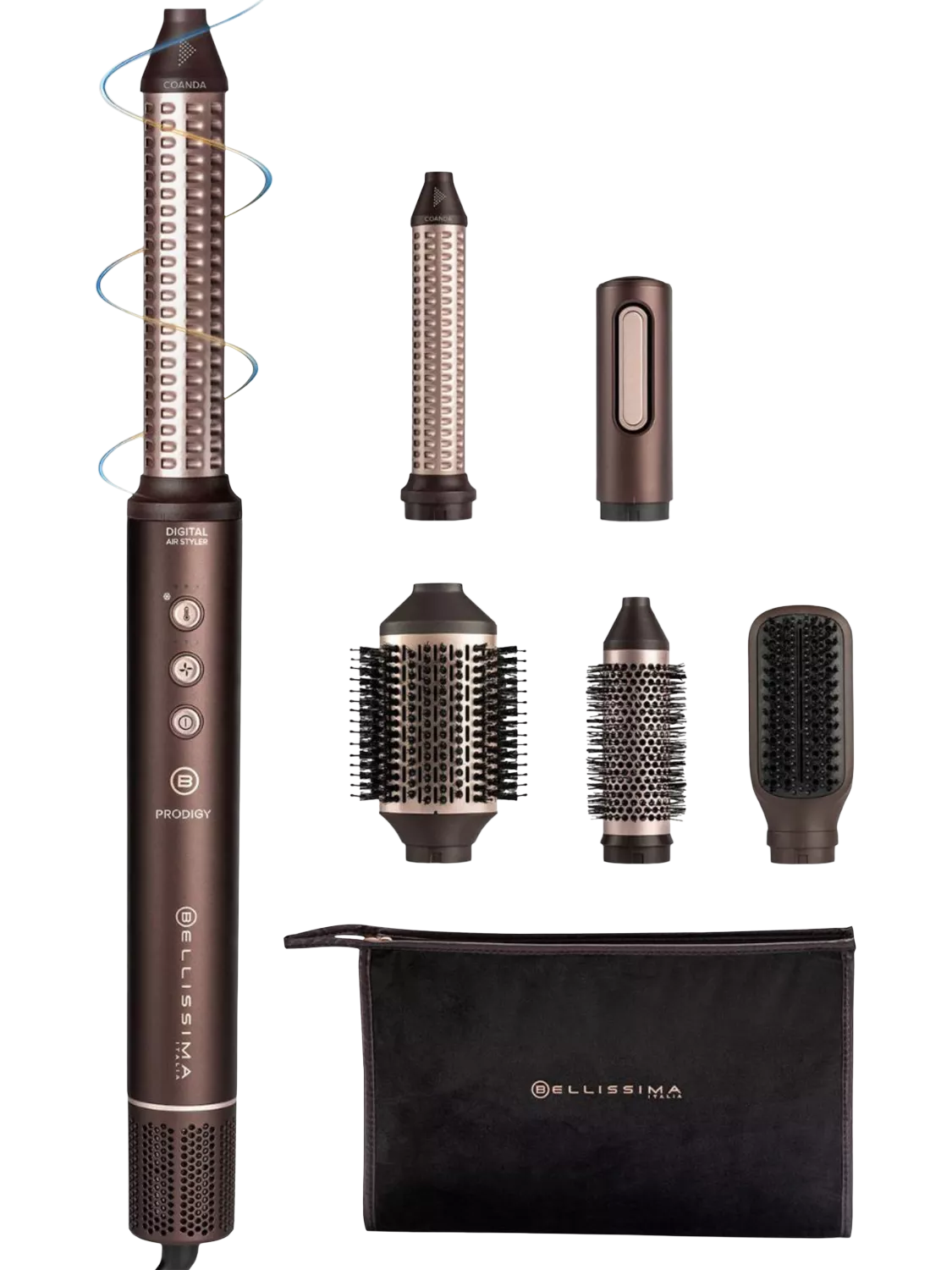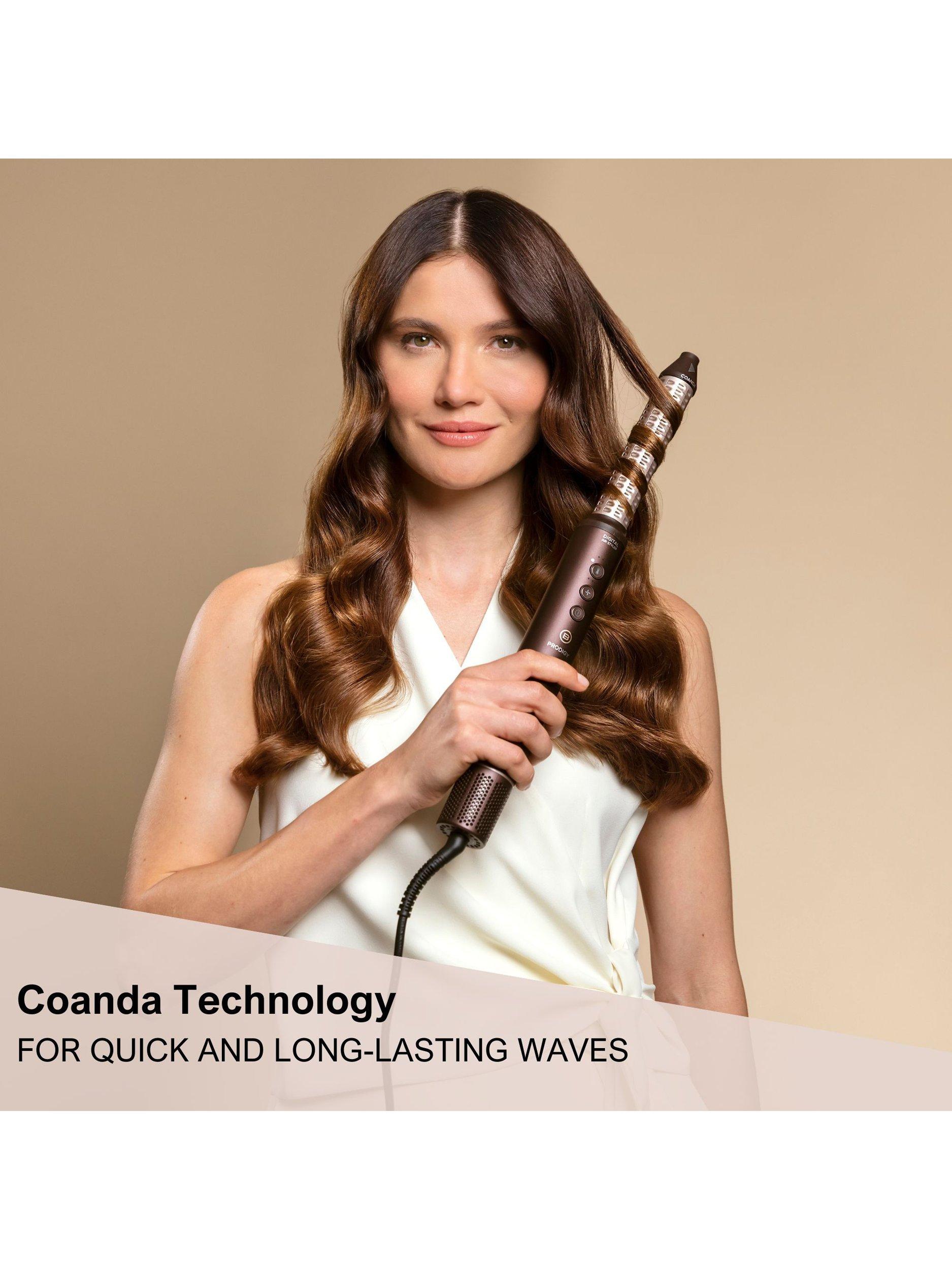 Prodigy: the ultimate styler for effortless, damage-free hair*. Ion Ceramic Hi-Pro technology ensures soft, frizz-free hair**. Coanda Technology wraps hair for perfect curls and waves quickly. The digital motor delivers high-speed airflow, drying and styling faster than conventional dryers***. Six accessories and beauty bag.