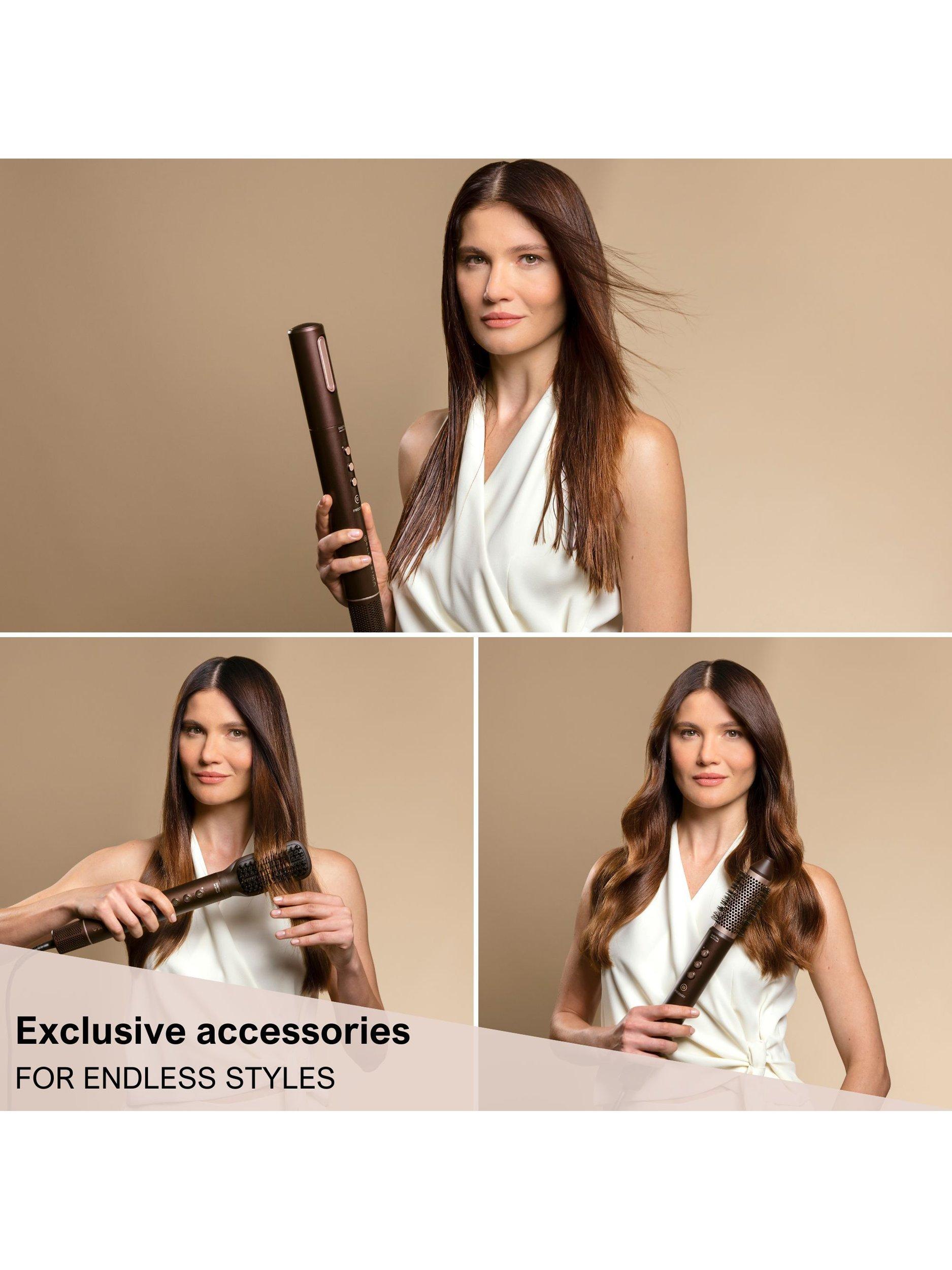 The styler offers six exclusive attachments for versatile styling. The Gentle Dry attachment provides quick and gentle pre-drying. The Coanda Technology attachment effortlessly creates defined curls and waves. The Volume & Straight attachment adds volume or achieves a sleek look, while the 32mm Brush is perfect for various styles. The Detangle & Smooth attachment ensures a smooth finish. Plus, the Luxury Beauty Bag keeps everything organized, ideal for travel. Achieve endless styles with ease and precision!