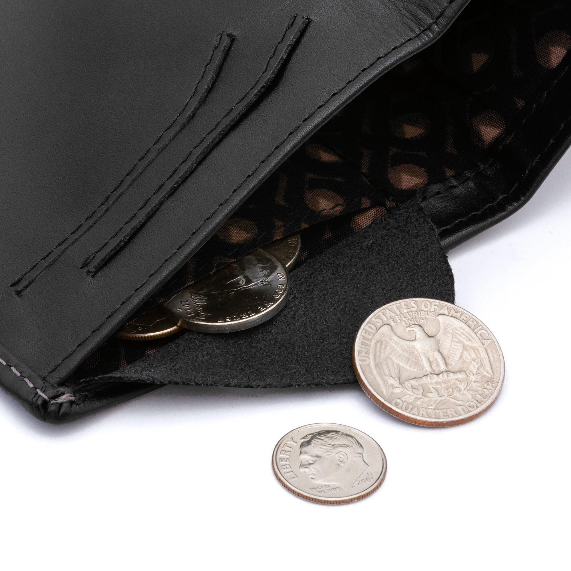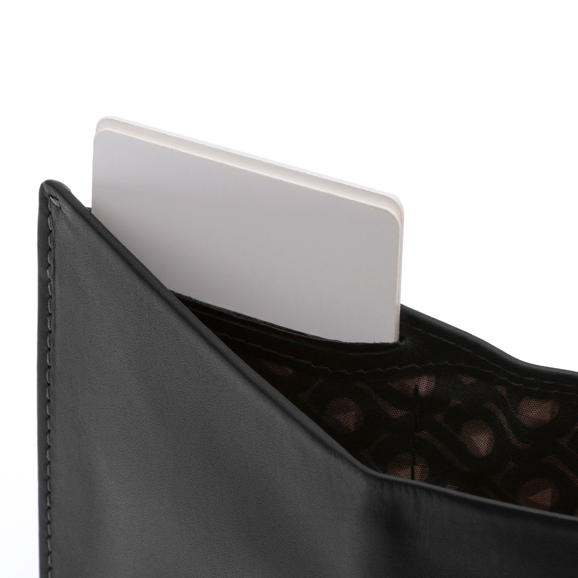 Crafted from premium vegetable-tanned leather in a slim profile, it features a note compartment wide enough for even the largest bills, discreet coin pouch that doubles as a business card protector, three quick access slots for your most important cards, and a pull tab section for less used cards.