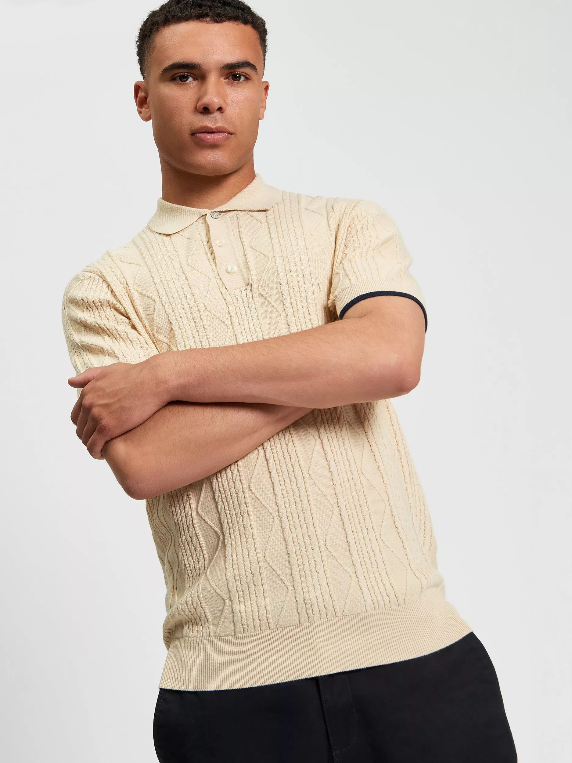 This short-sleeve knitted cable texture polo features a three-button placket and a Ben Sherman branded woven label on the side seam.