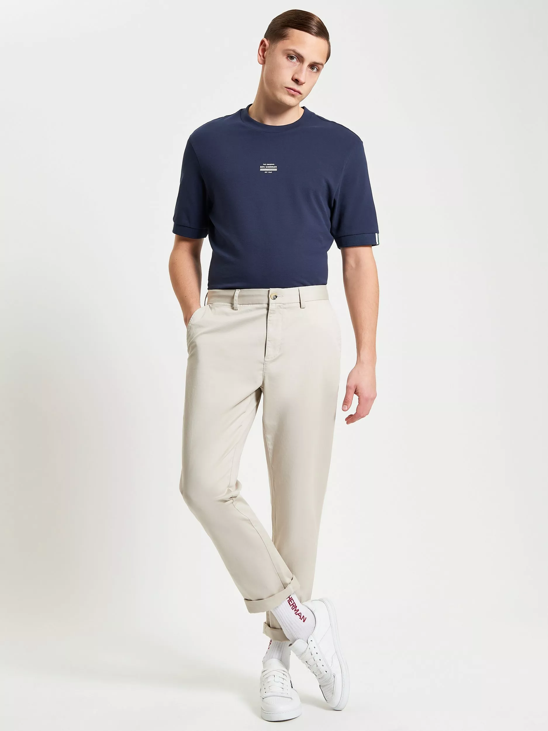 A classic slim fit cotton chino. Features include Ben Sherman buttons, mod stripe hem detailing and a branded Ben Sherman badge. This piece has two side pockets and 2 jet pockets.
