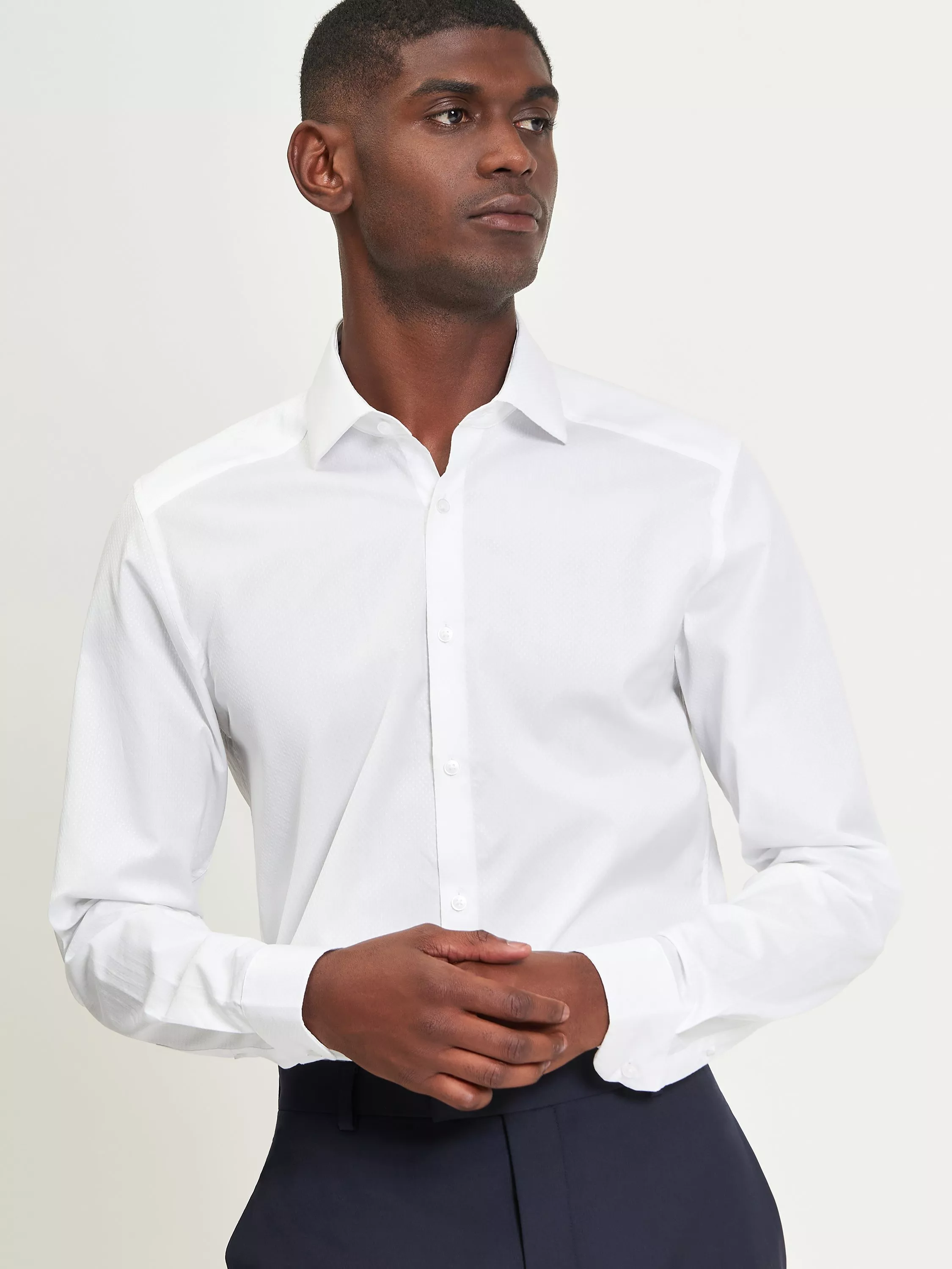The Ben Sherman diamond dobby formal shirt in a signature soho slim fit. Complete with mod tape detailing to the side vents and internal collar. For a clean finish the style includes a bluff placket as well as fusing and flexible bones to the internal collar.