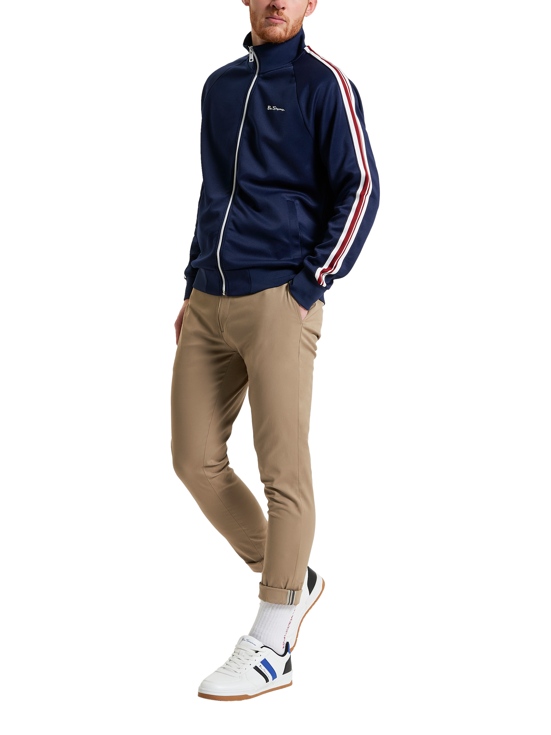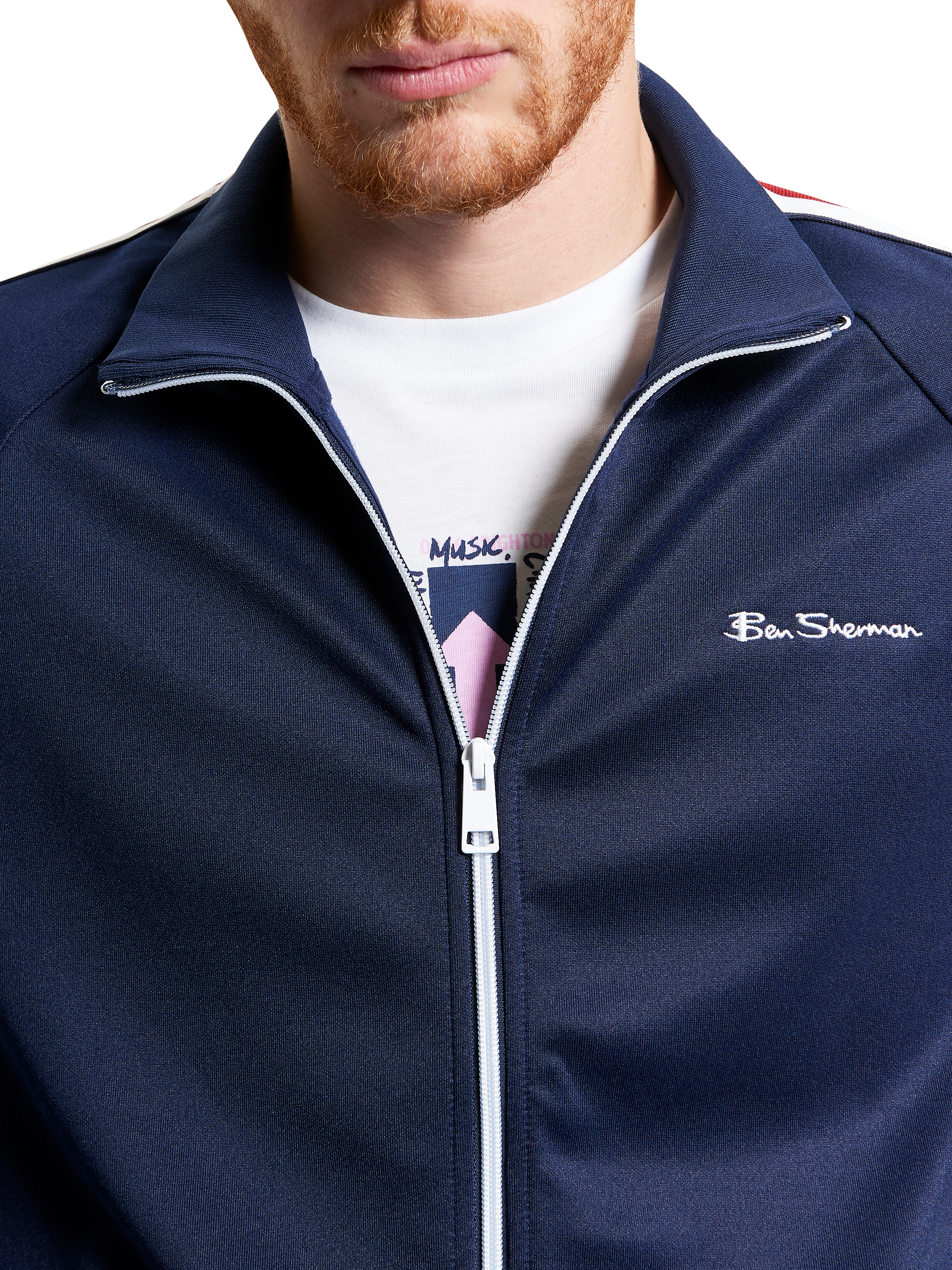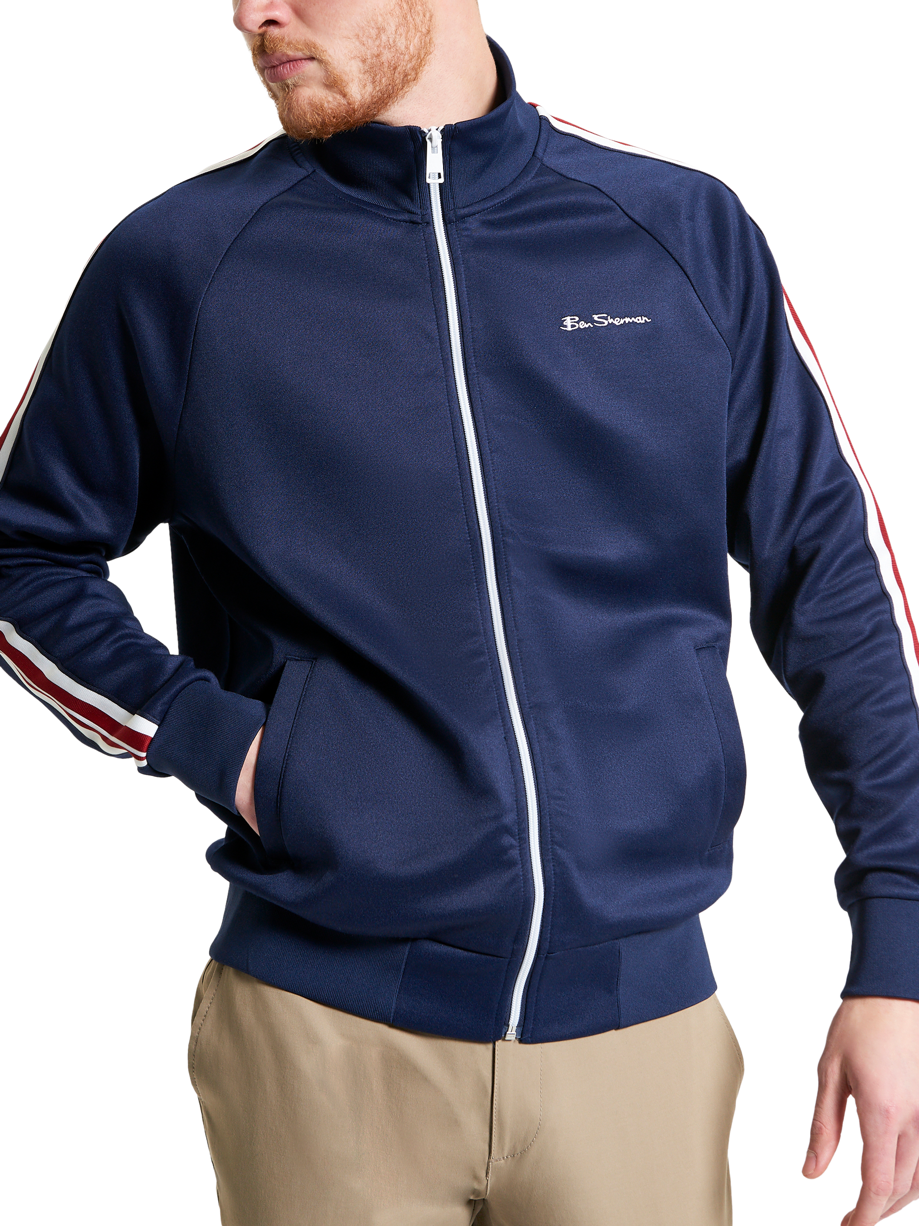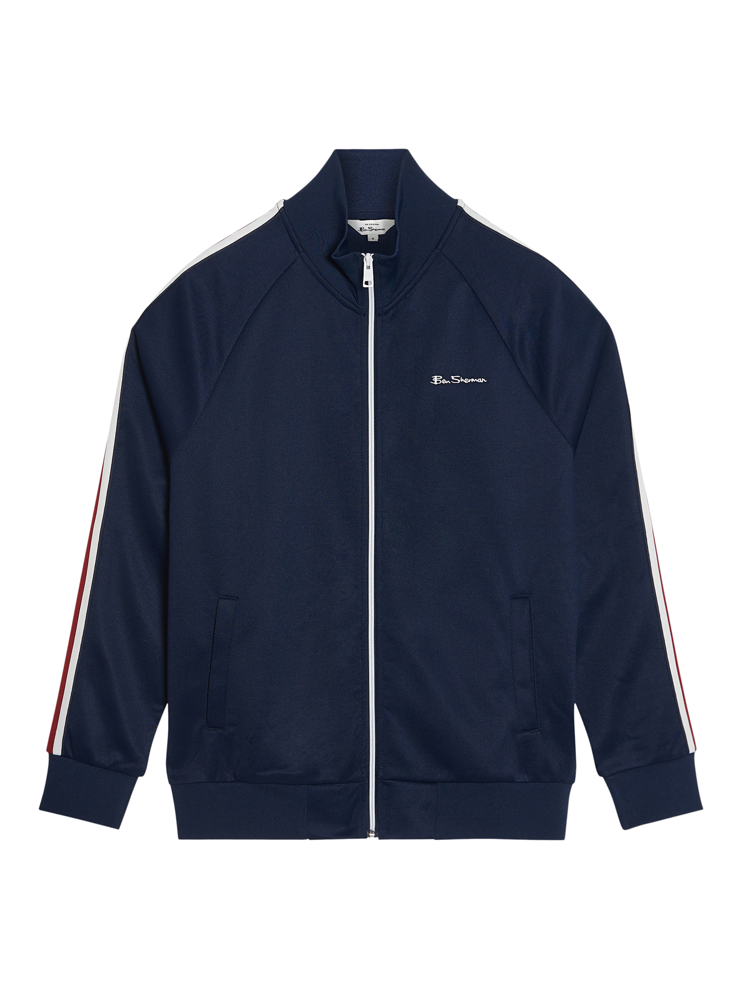 Ben Sherman's signature track top is made from a recycled polyester blend in a regular fit. It features house tape down the sleeves, and contrasting Ben Sherman embroidered branding on the left chest to set it apart from the pack.