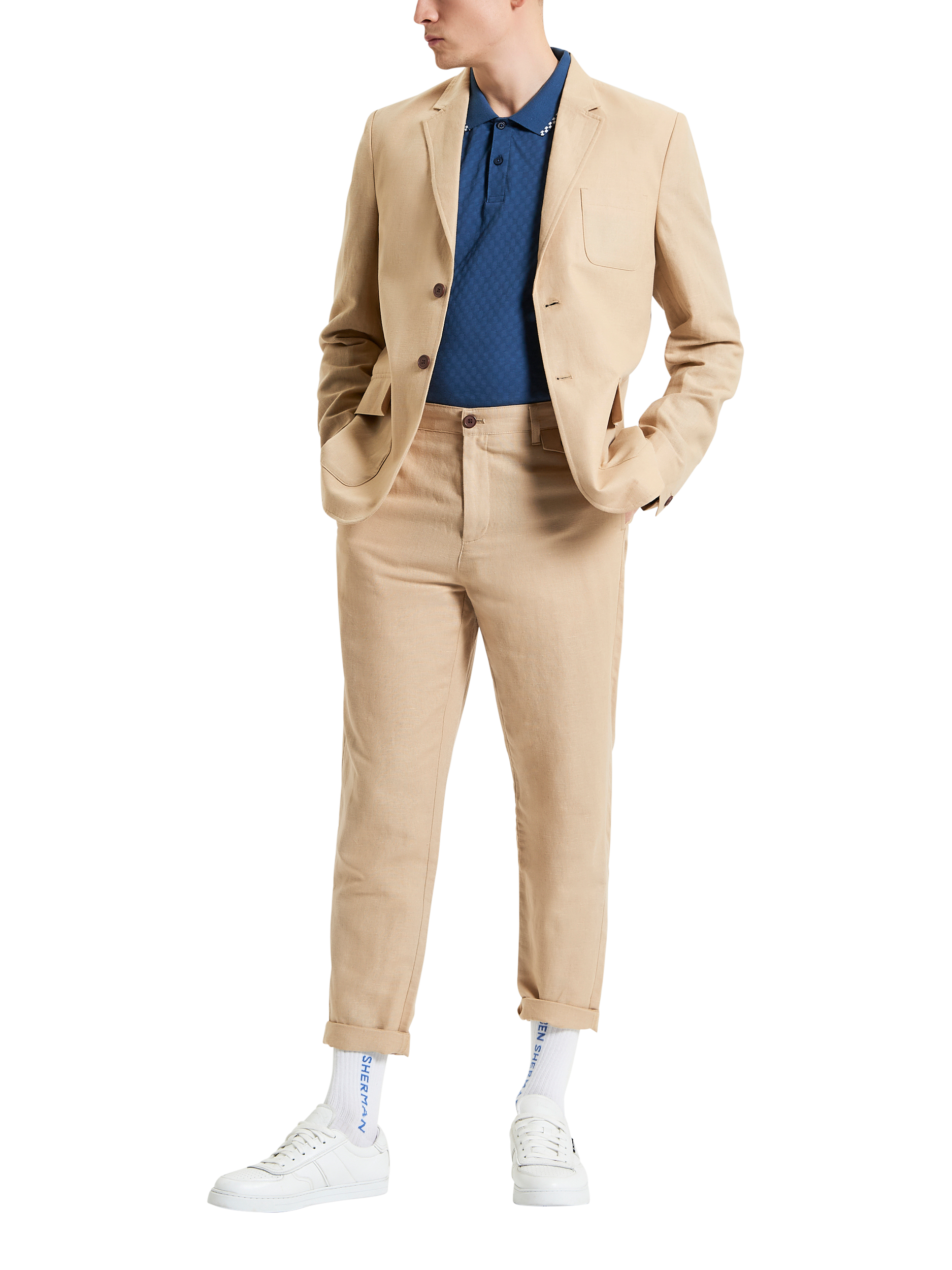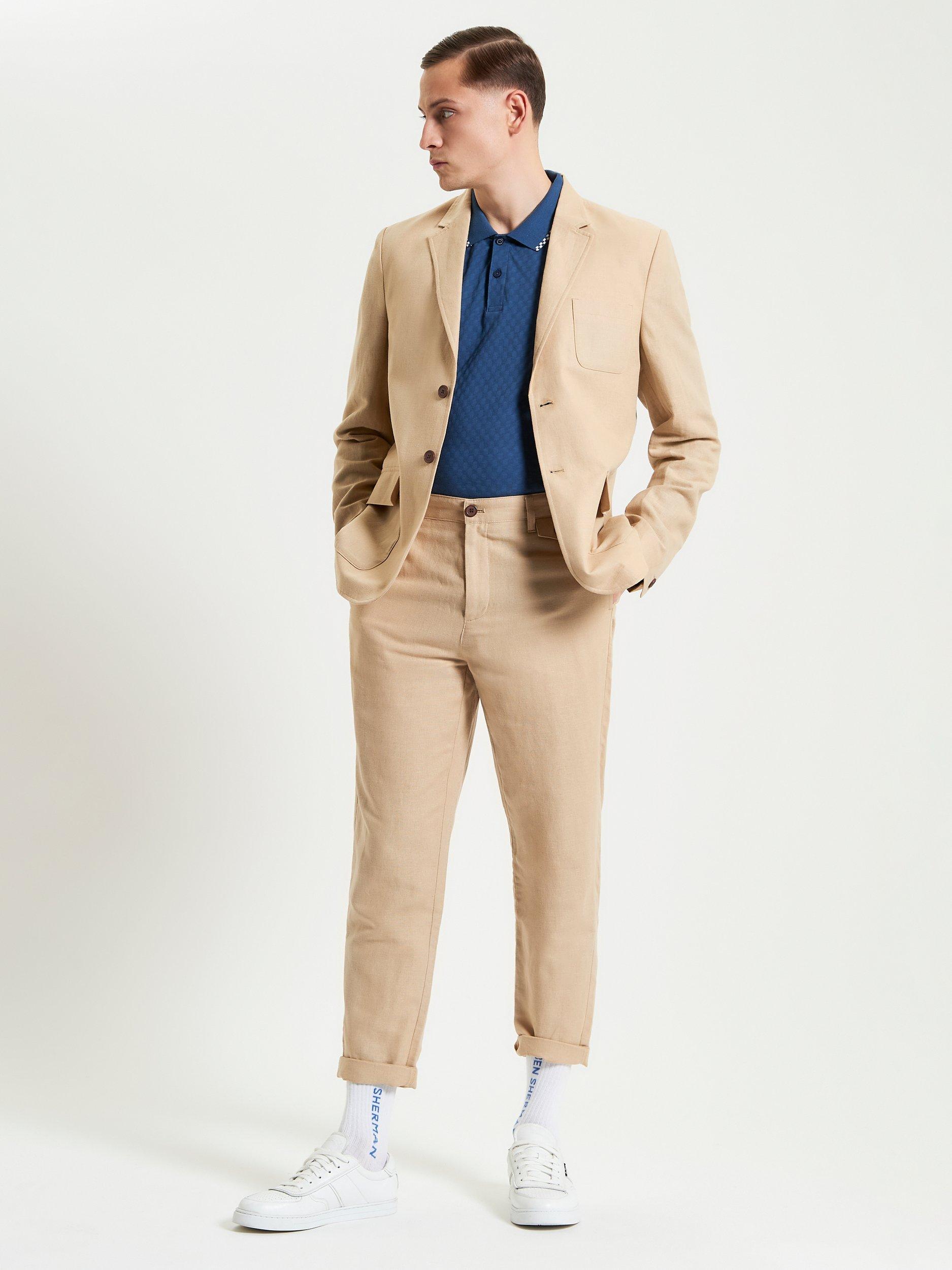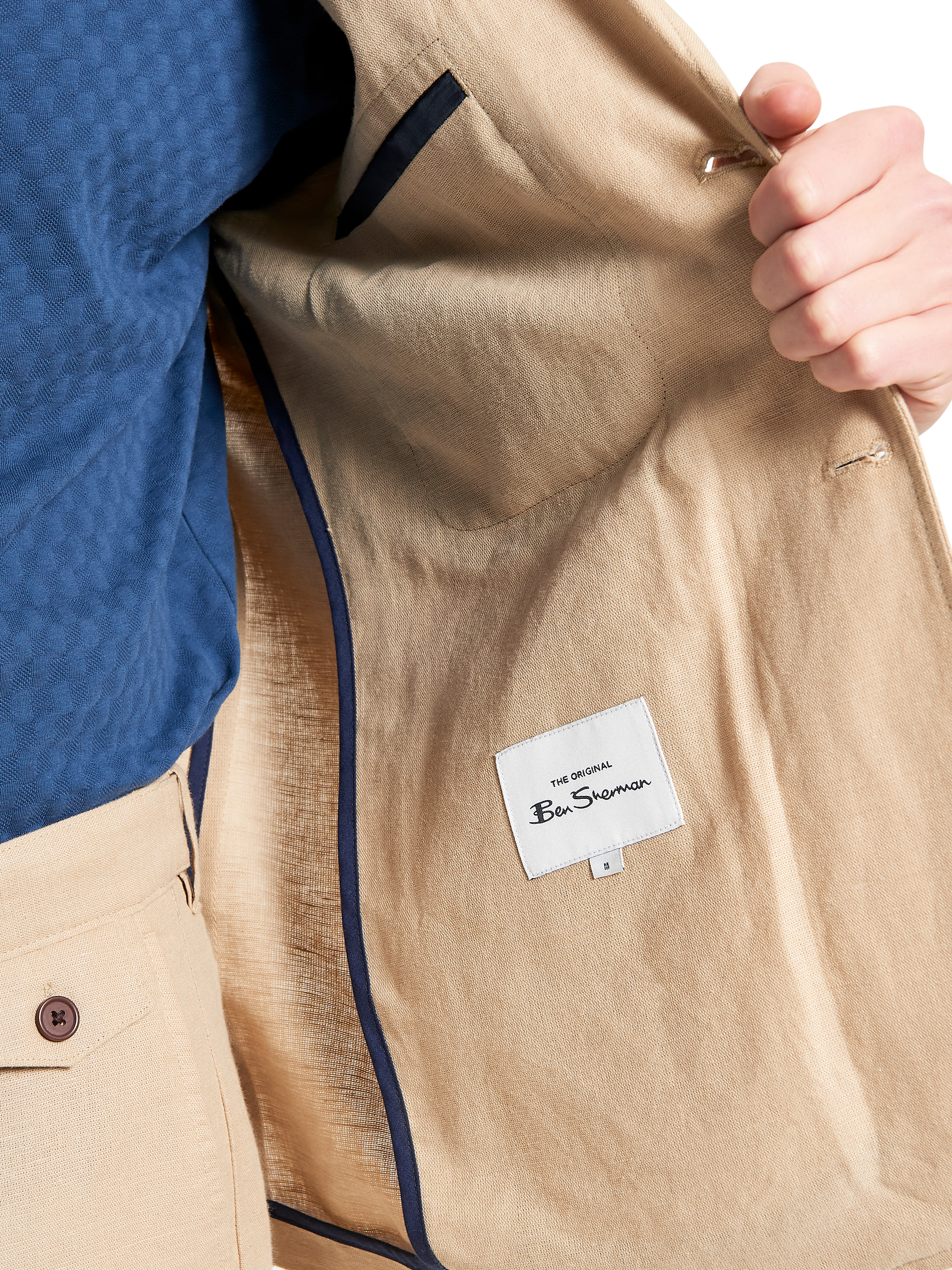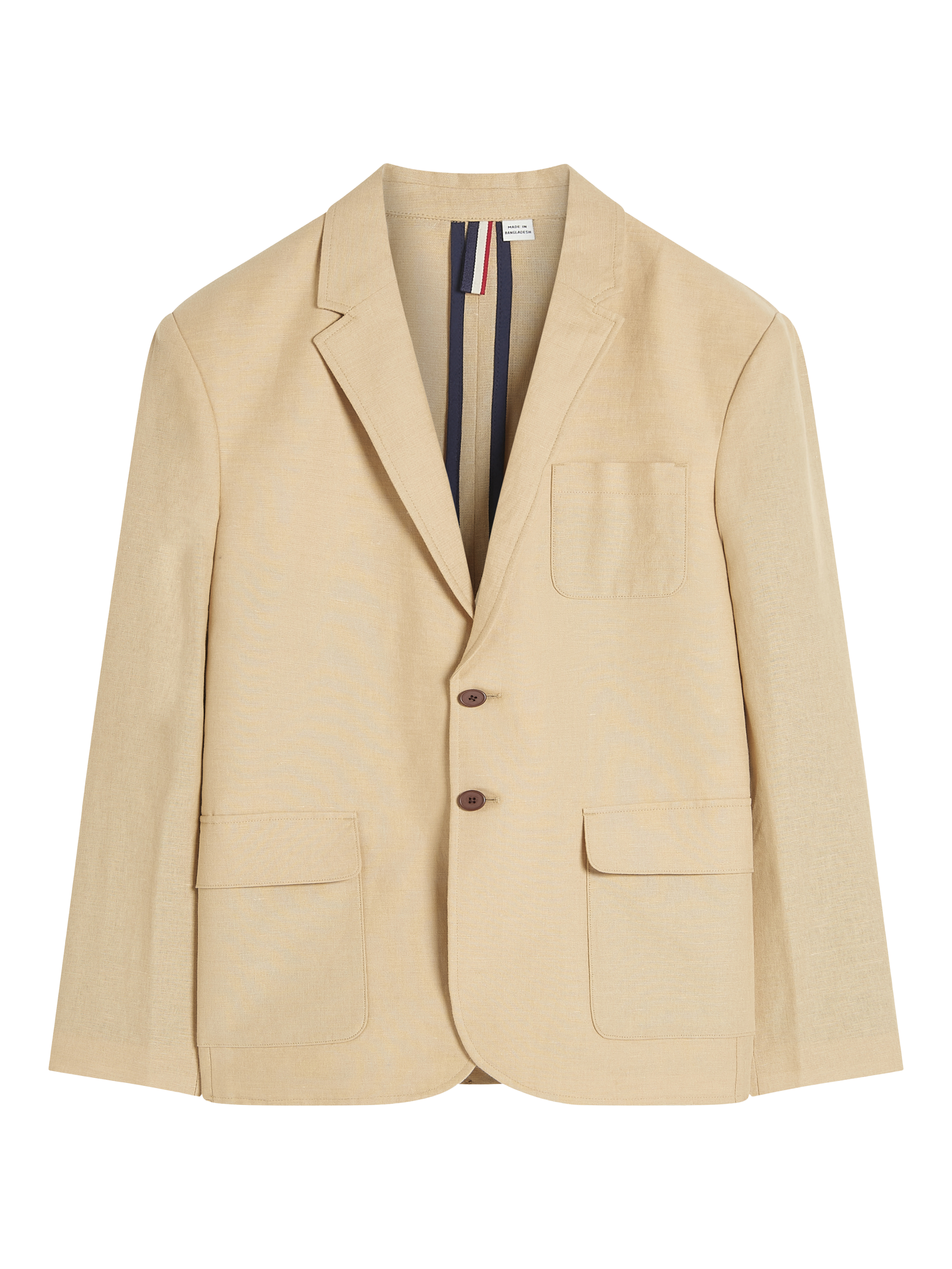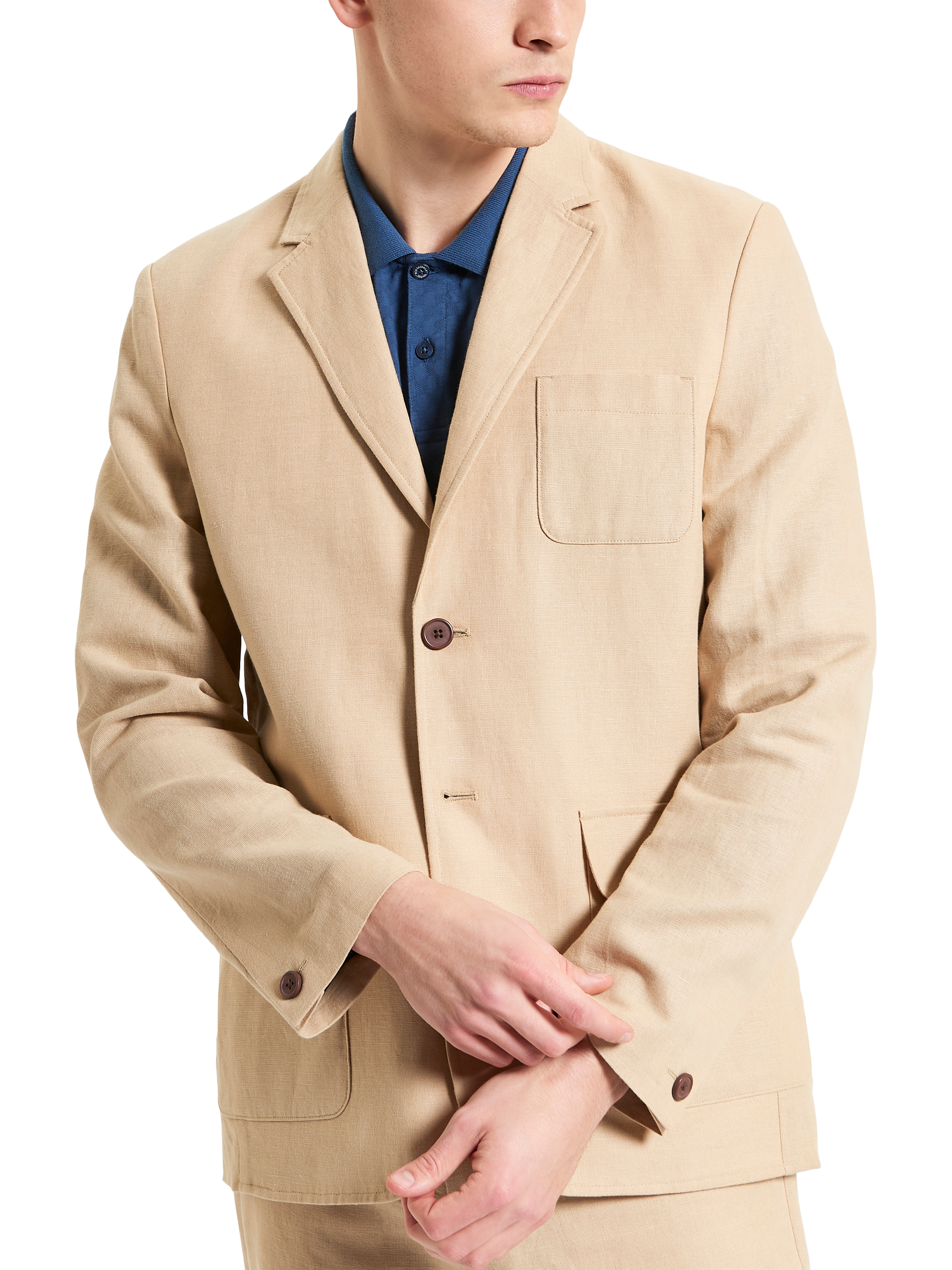 A linen blazer, unlined with contrast internal bound seams. This style features a notch lapel and three external patch pockets.