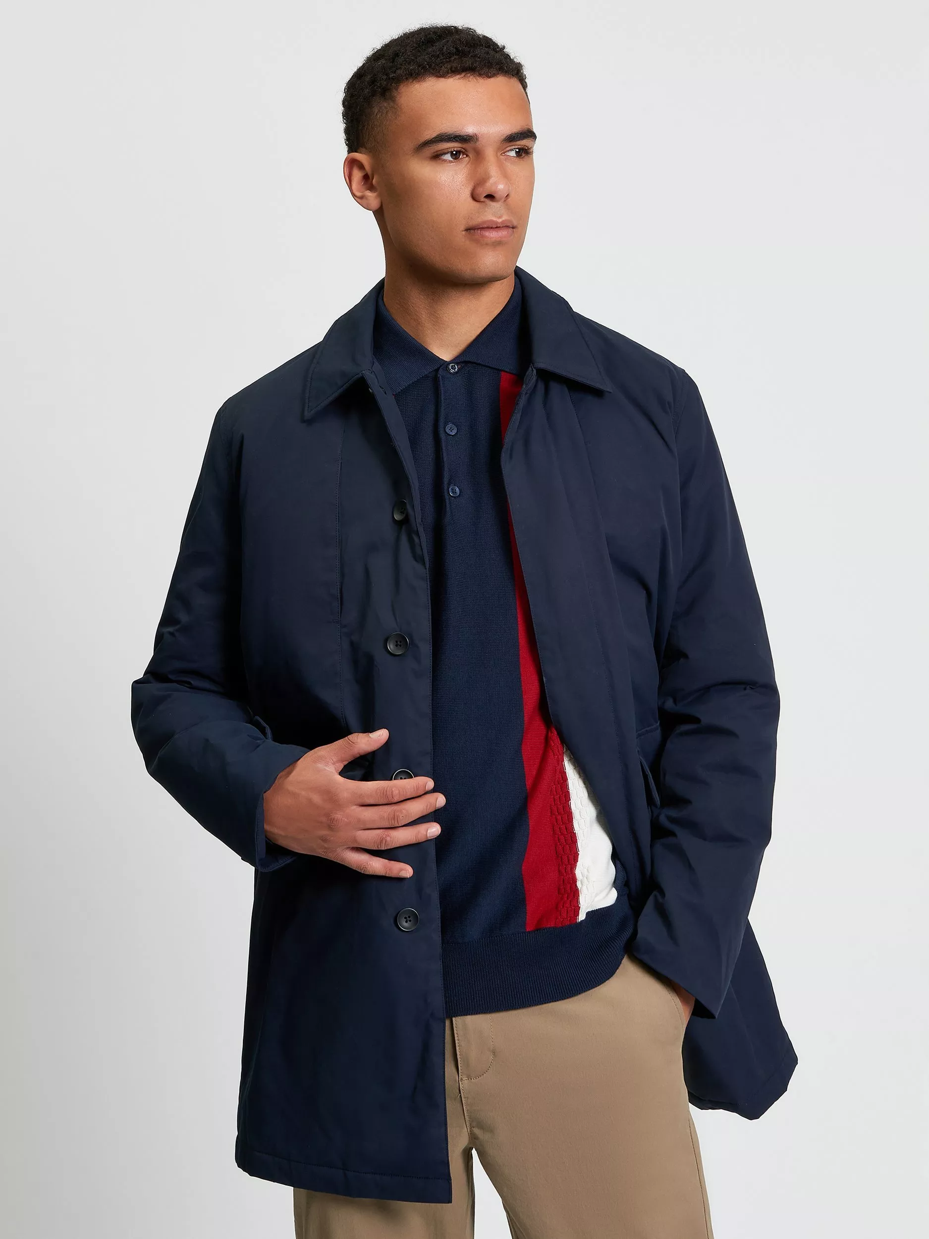 This Car Coat is made from a cotton blend. Featuring internal house check lining at the top and vertical wadded quilting at the bottom. Completed with a button fastening and a Ben Sherman branded woven label on the left pocket.