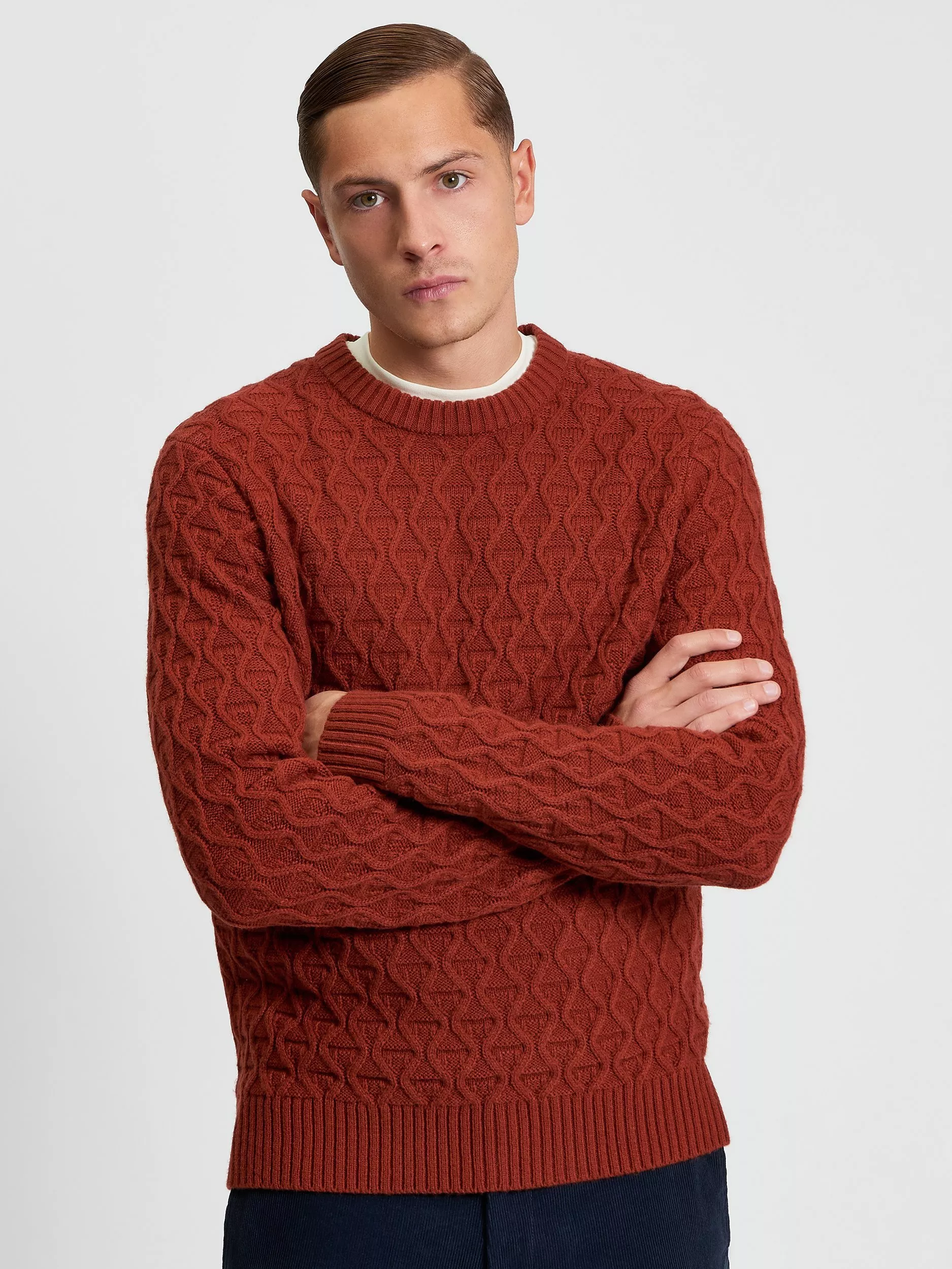 Made from a wool blend, this regular fit cable texture crew features a Ben Sherman branded woven label on the side seam.