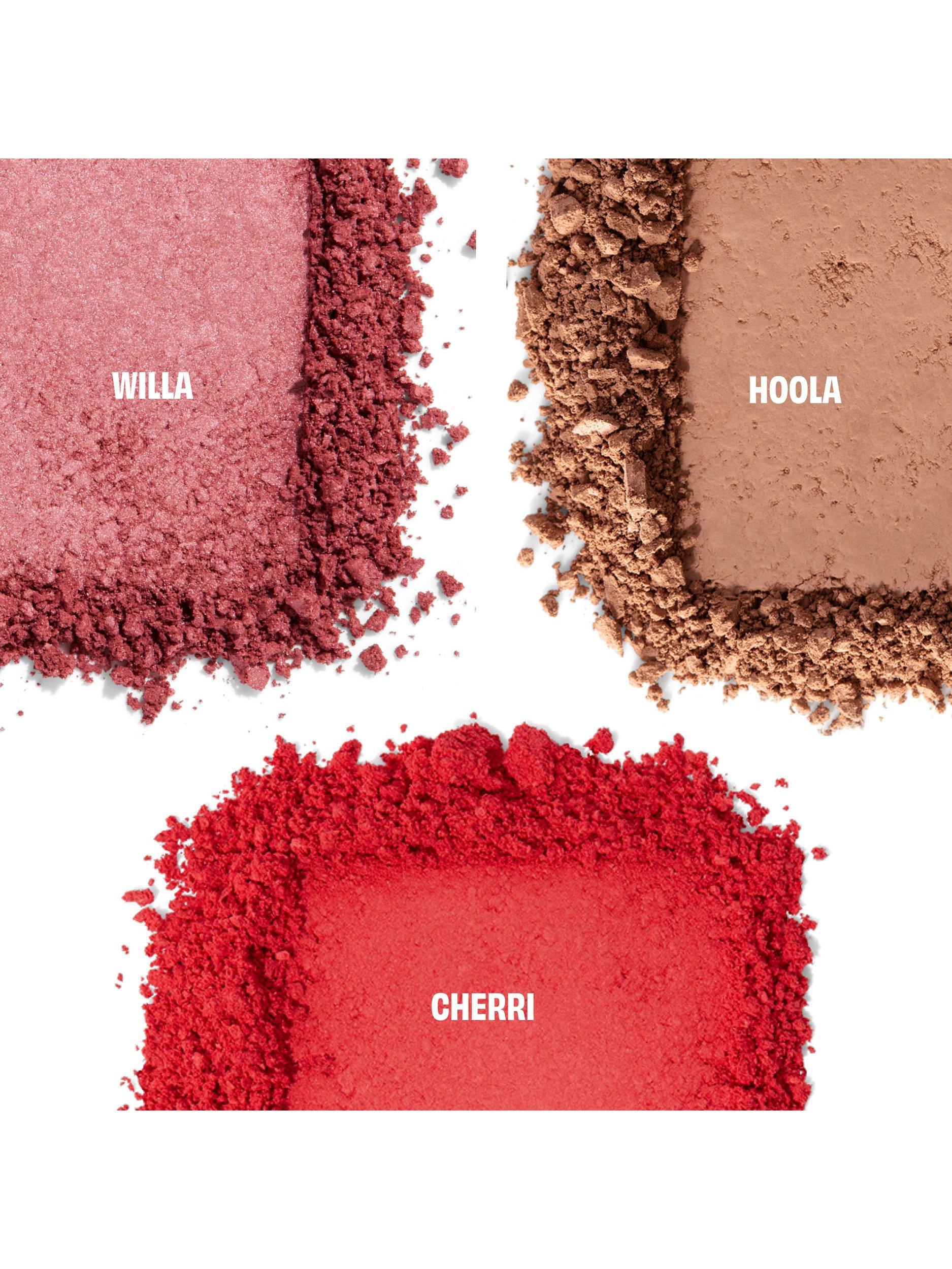 Minis of Hoola matte bronzer, Willa soft neutral-rose blush and Cherri bright cherry-red blush.