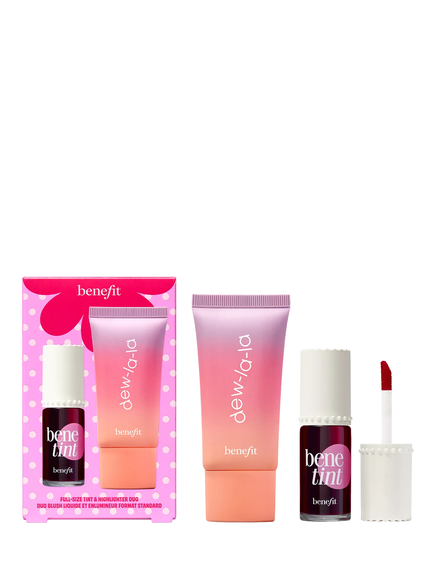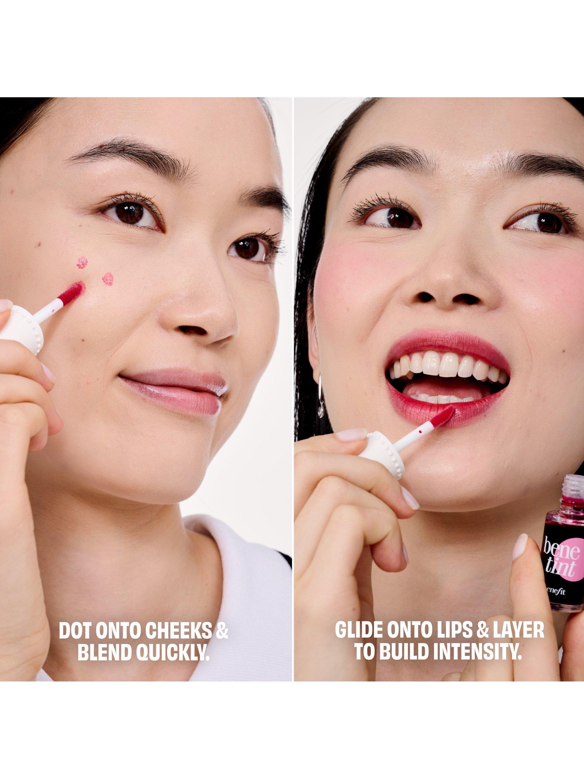 Dew The Benetint full-size rose-tinted lip and cheek stain and liquid highlighter duo.