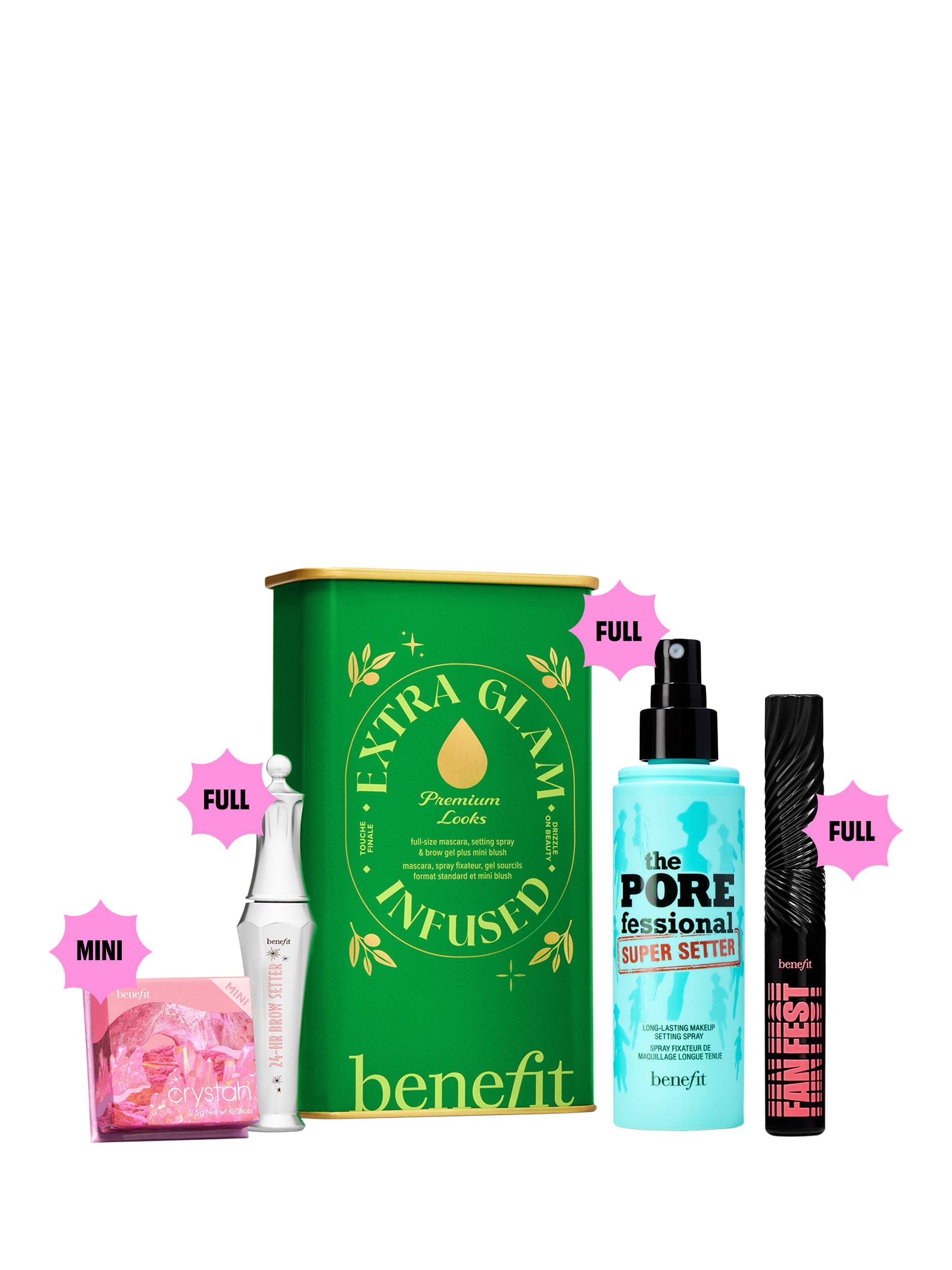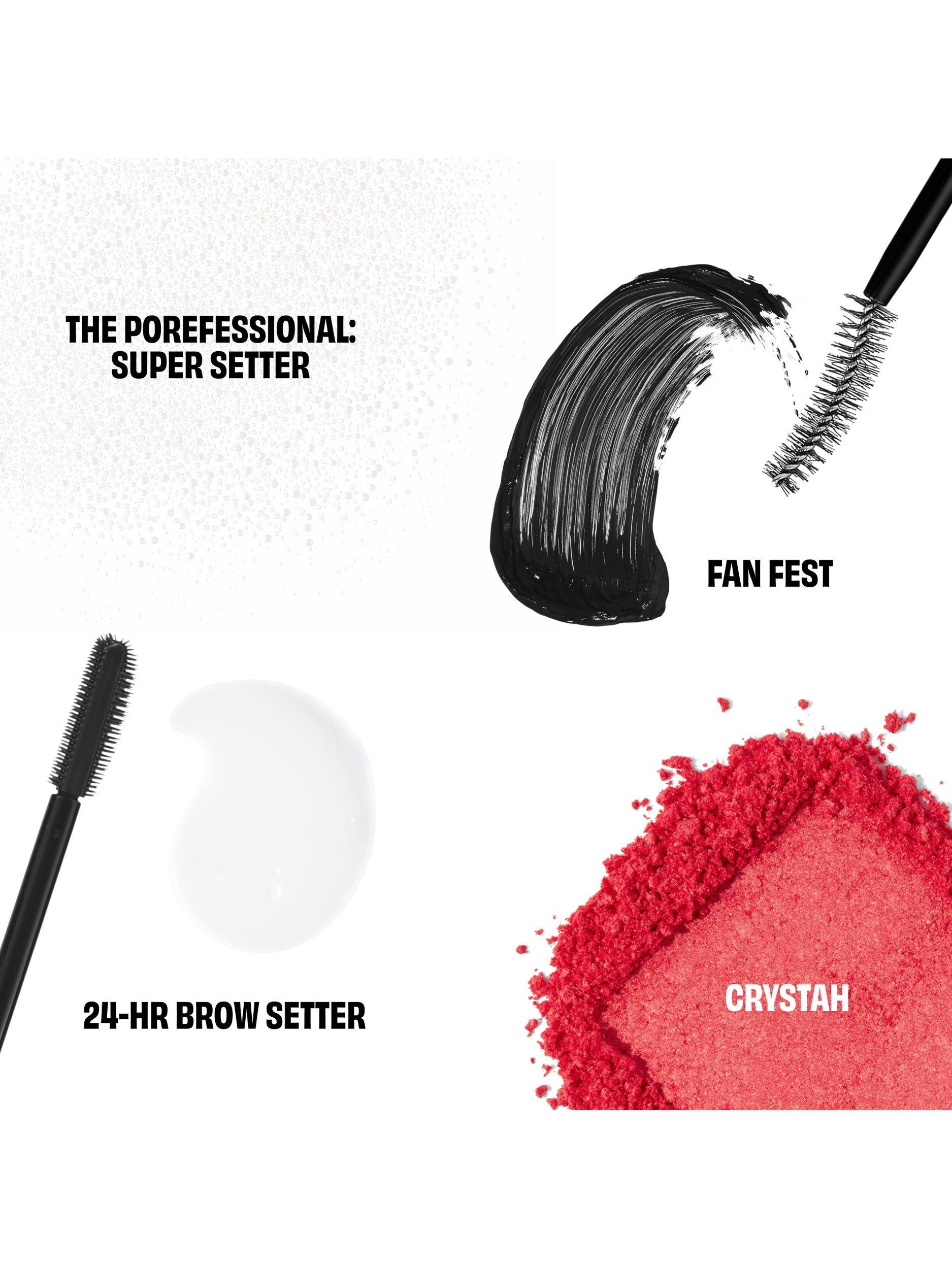Full-size Fan Fest Mascara, The POREfessional Setting Spray, 24-hour Brow Setting Gel and Crystah Mini Blush.