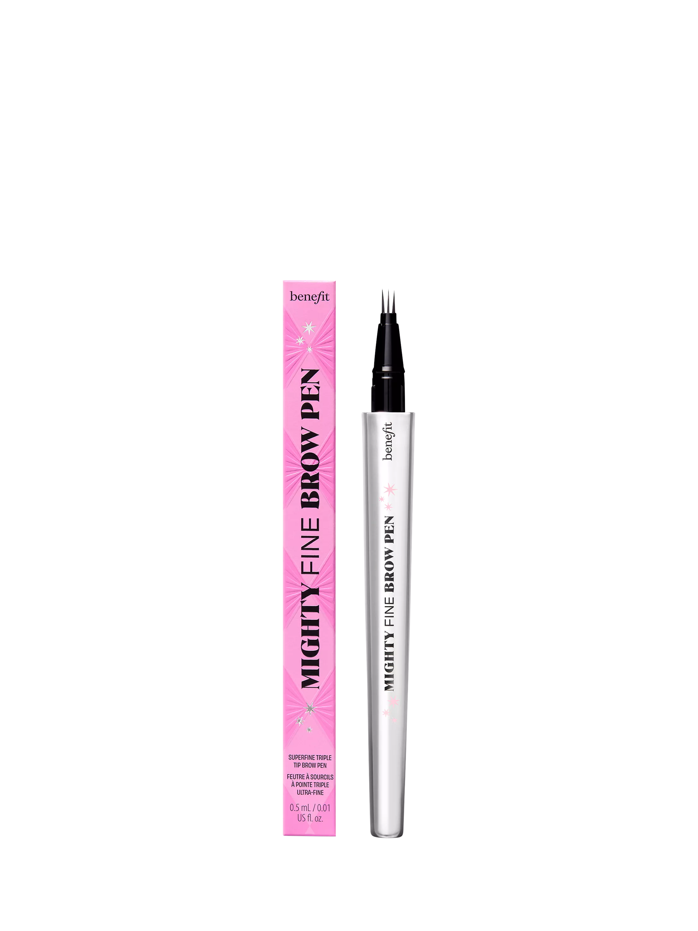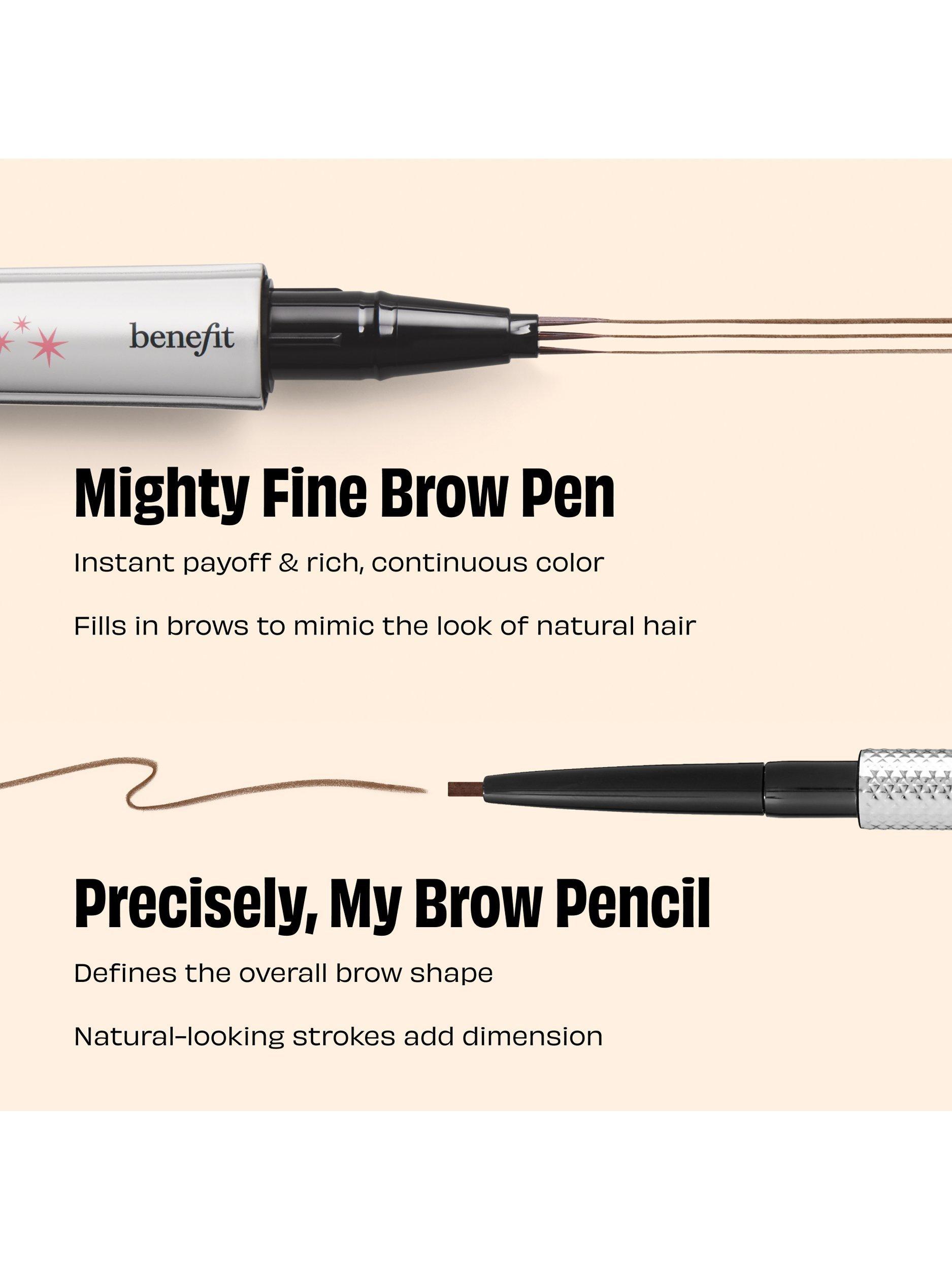 With 0.1mm brush tips, Mighty Fine Brow Pen is the finest triple-tip brow pen out there – seriously, we checked. It instantly fills in brows and mimics the look of natural hair for a full, defined look that lasts and lasts. Shake it up and flick it onto clean, dry brows, for your own Mighty Fine moment.