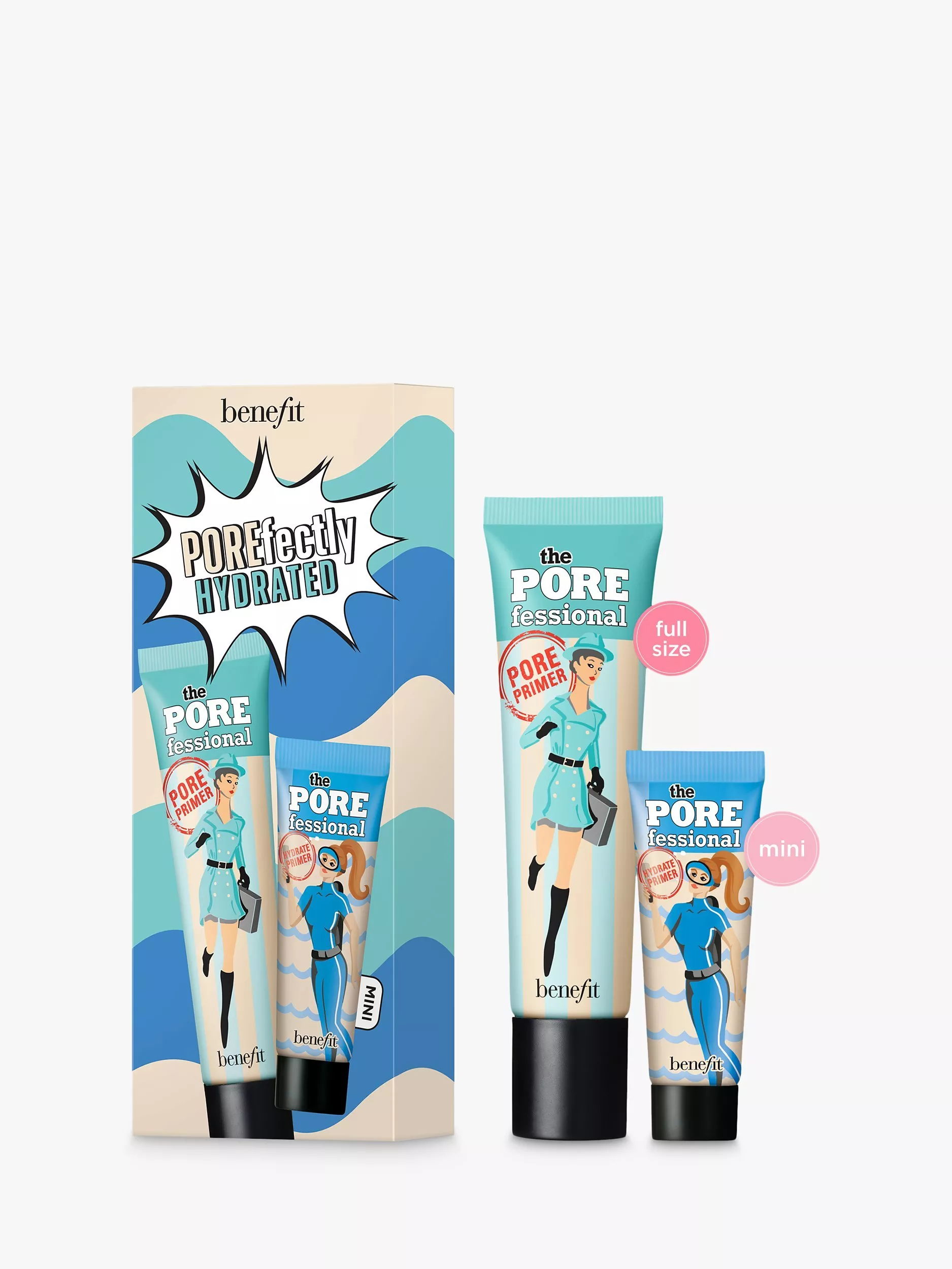 Fight all your pore problems with Benefit’s bestselling face primers! Minimise the look of pores and fine lines, help makeup stay put and defeat dryness with this power primer pair. Includes a full size of our original #1 smoothing face primer and a mini hydrating primer for 12 hours* of hydration and refreshed moisturised skin.
