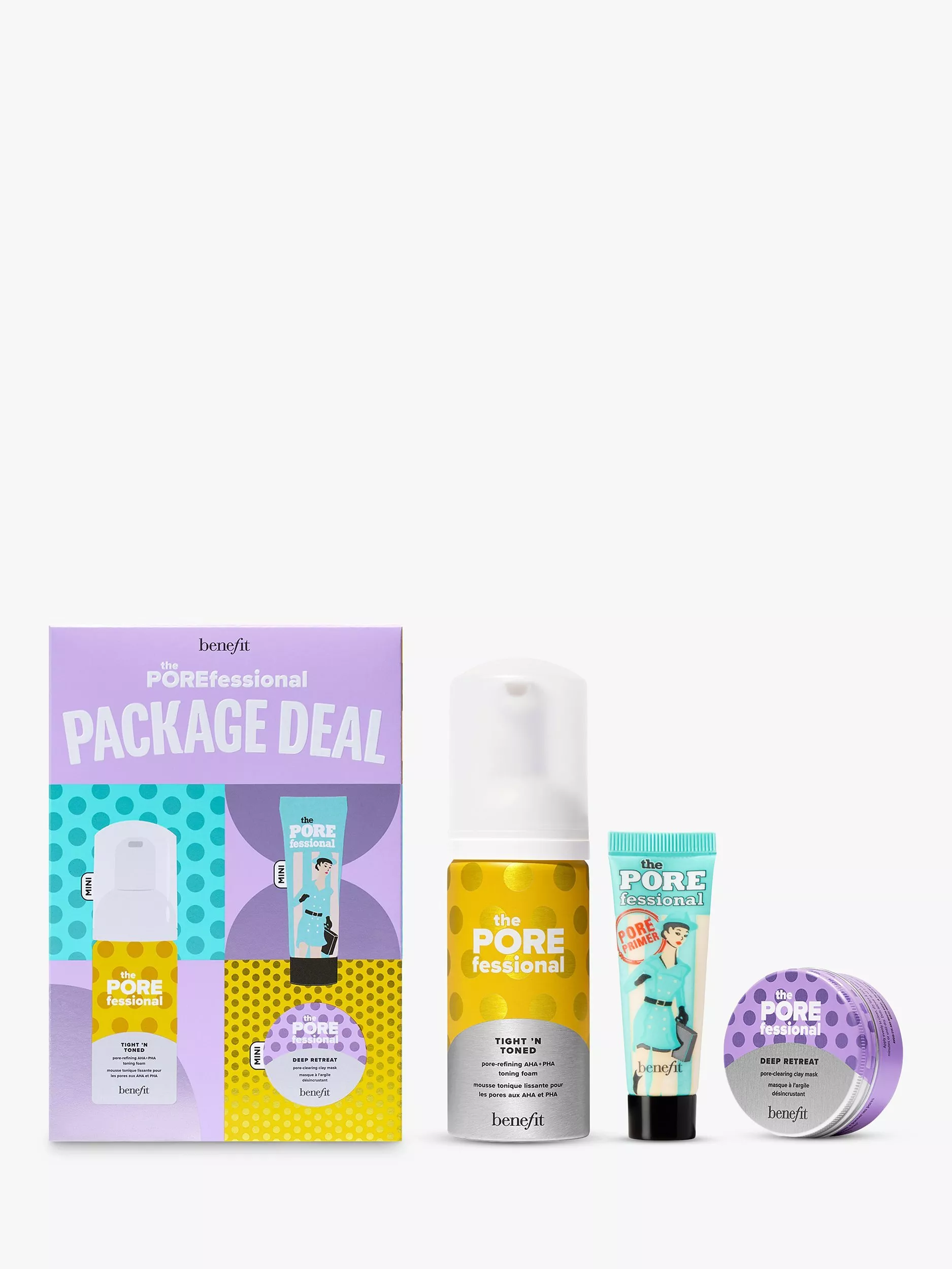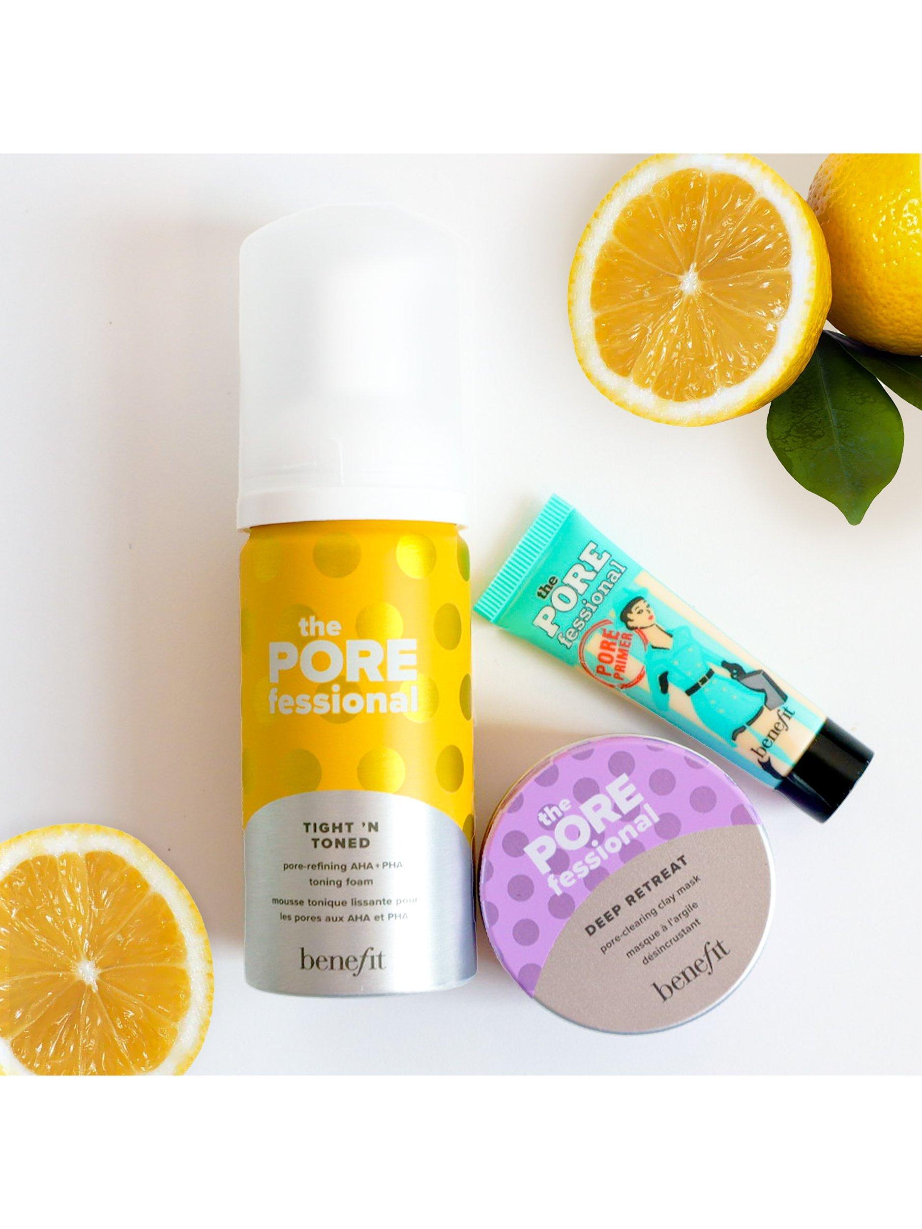 Refine, clear and visibly smooth skin with this mini pore-lovin' trio. Tight ’n Toned AHA+PHA toner refines and tones the look of pores with a quick-absorbing foam formula, while Deep Retreat clay mask clears pores and minimises excess surface skin oil. Top things off with Benefit’s iconic The POREfessional pore primer for a smoother-than-smooth finish. Includes a free sample of Good Cleanup pore-purifying foaming cleanser.