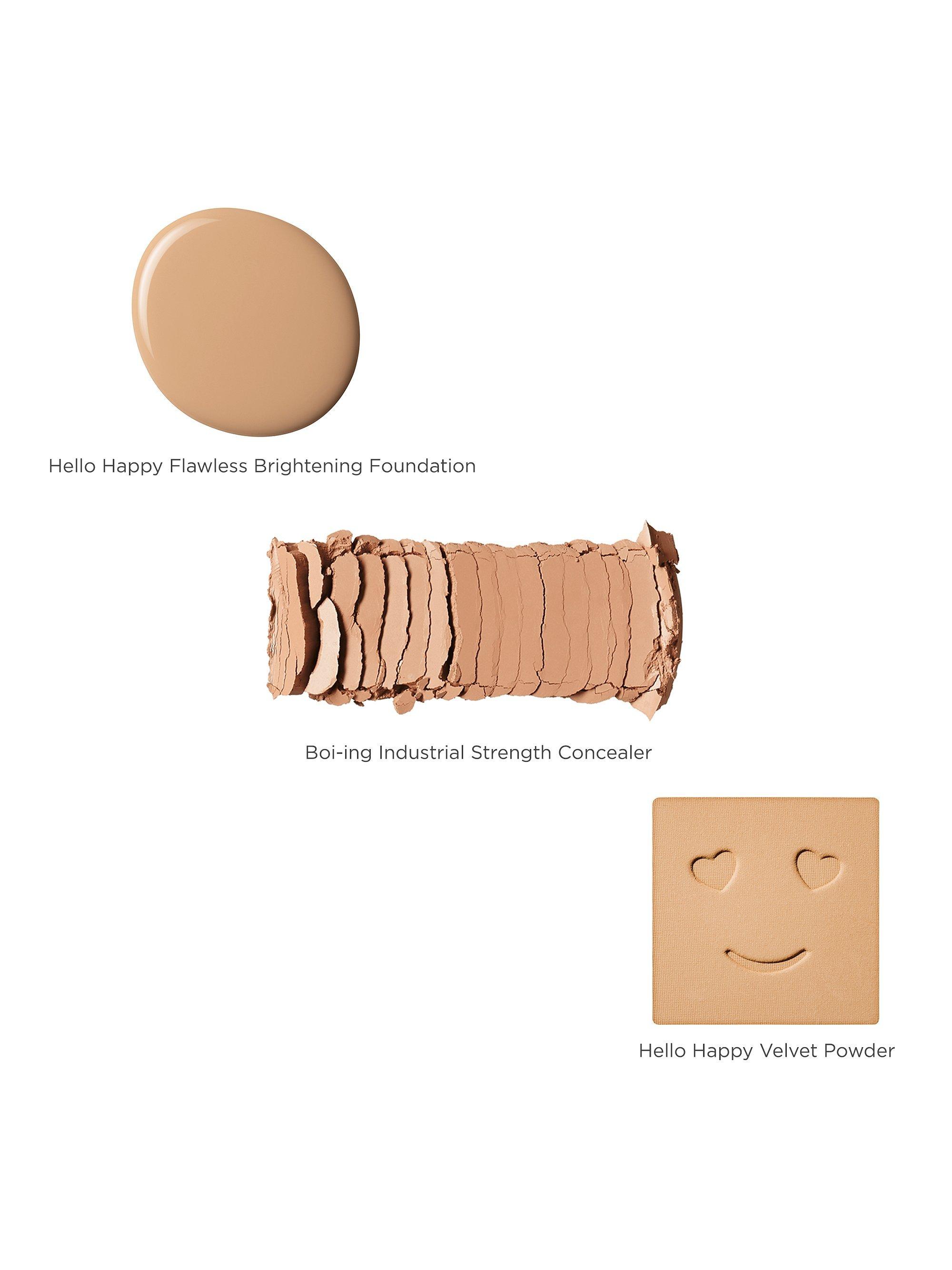 Happiness is a flawless-looking complexion! Dab Boi-ing Industrial Strength Concealer under eyes or onto face, then pat and blend gently with a fingertip. Next, blend Hello Happy Flawless Brightening Foundation onto clean, moisturised face, repeating to build coverage. Finish by sweeping on Hello Happy Velvet Powder Foundation with your favourite brush for light coverage or pat on with a sponge for medium/full coverage.