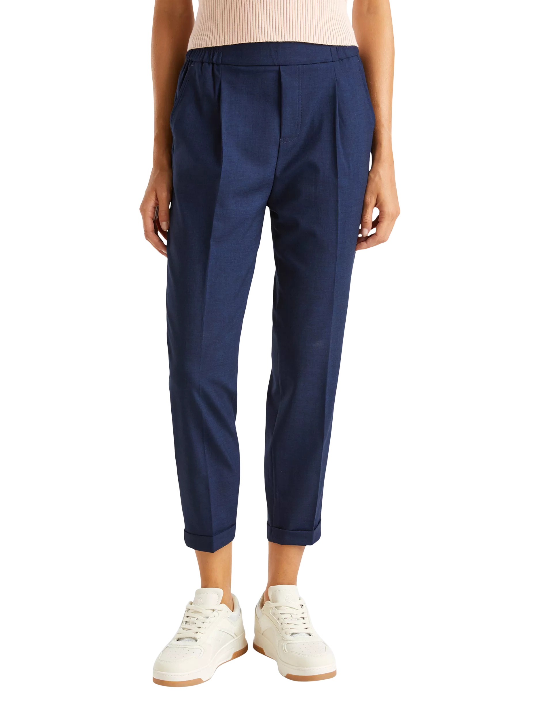 A pair of modern, slim-fit trousers from Benetton. This style is cut to sit mid rise with an elasticated waist and hems that are cropped.