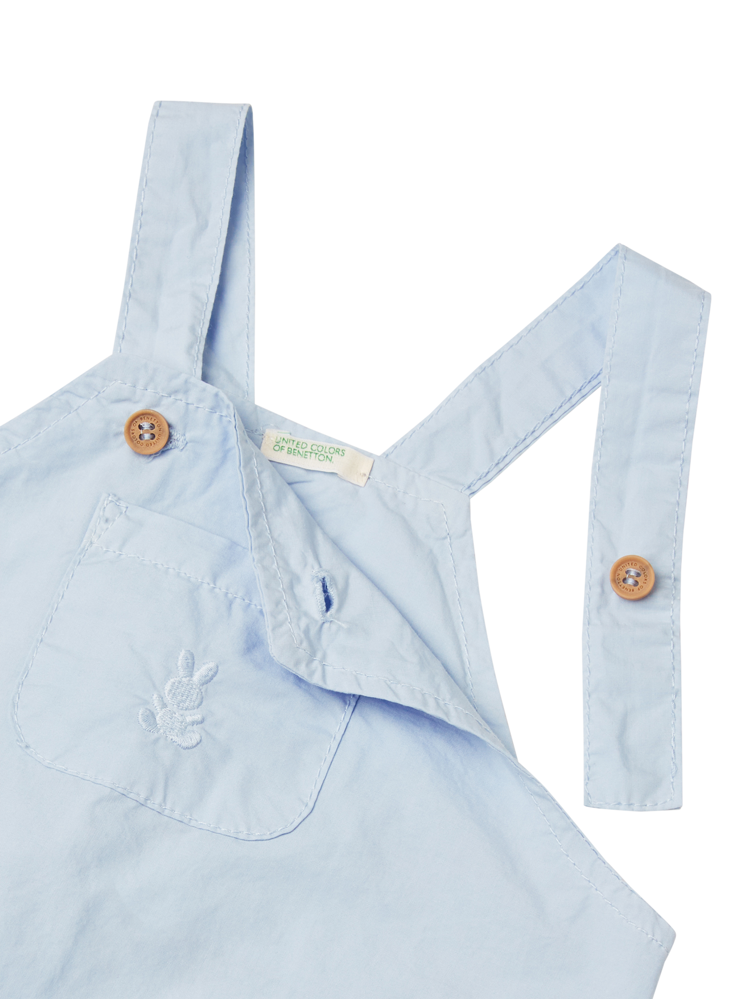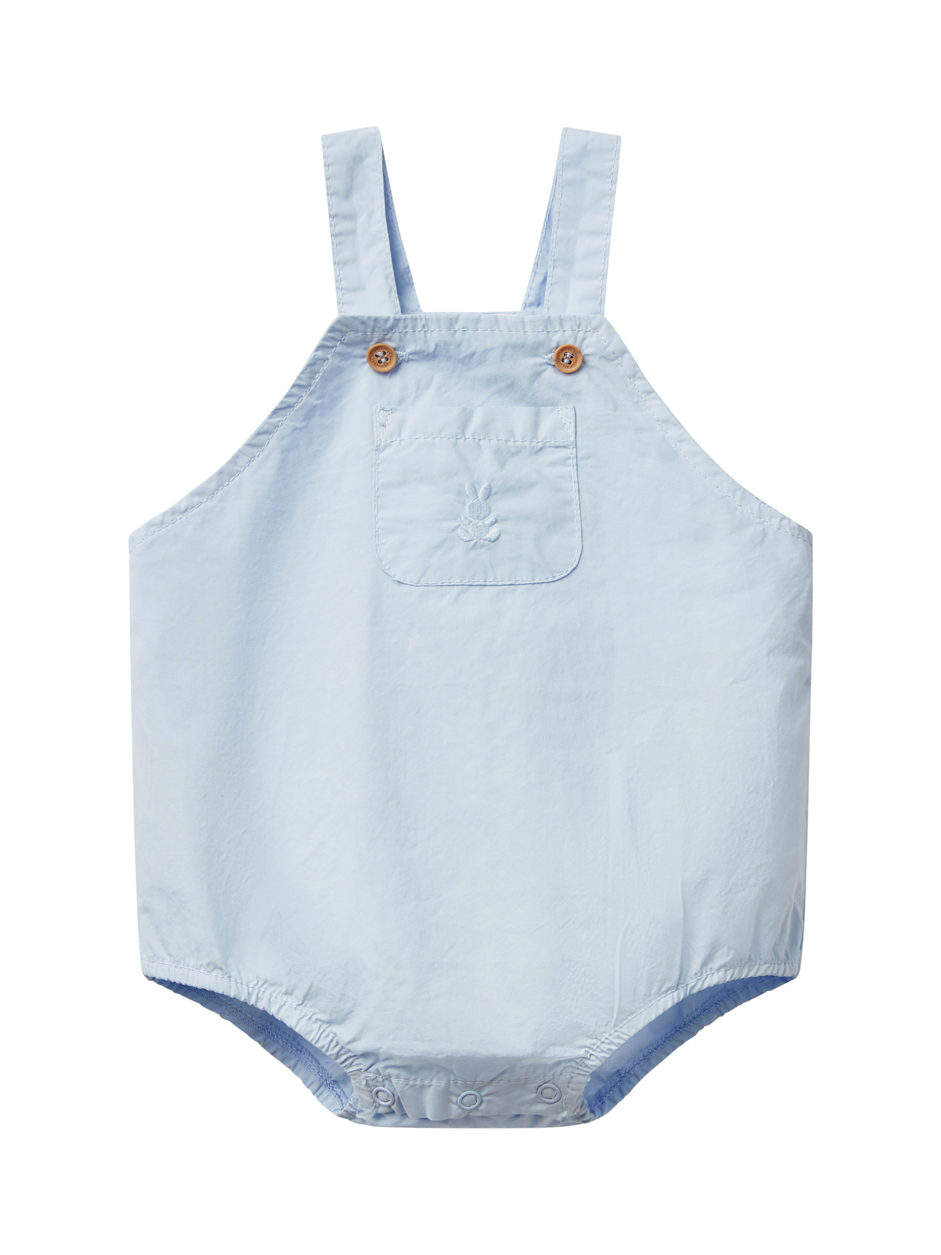 An adorable overall onesie in pure cotton from Benetton. Designed with adjustable shoulder straps with wood-look buttons, front pocket applique and inner elastic at leg opening. Finished with snap-button opening at the crotch.