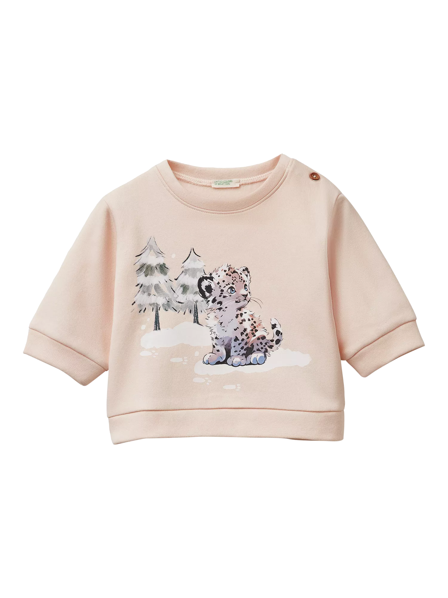 A crew neck sweatshirt with cuffed sleeves and a unique digital print.