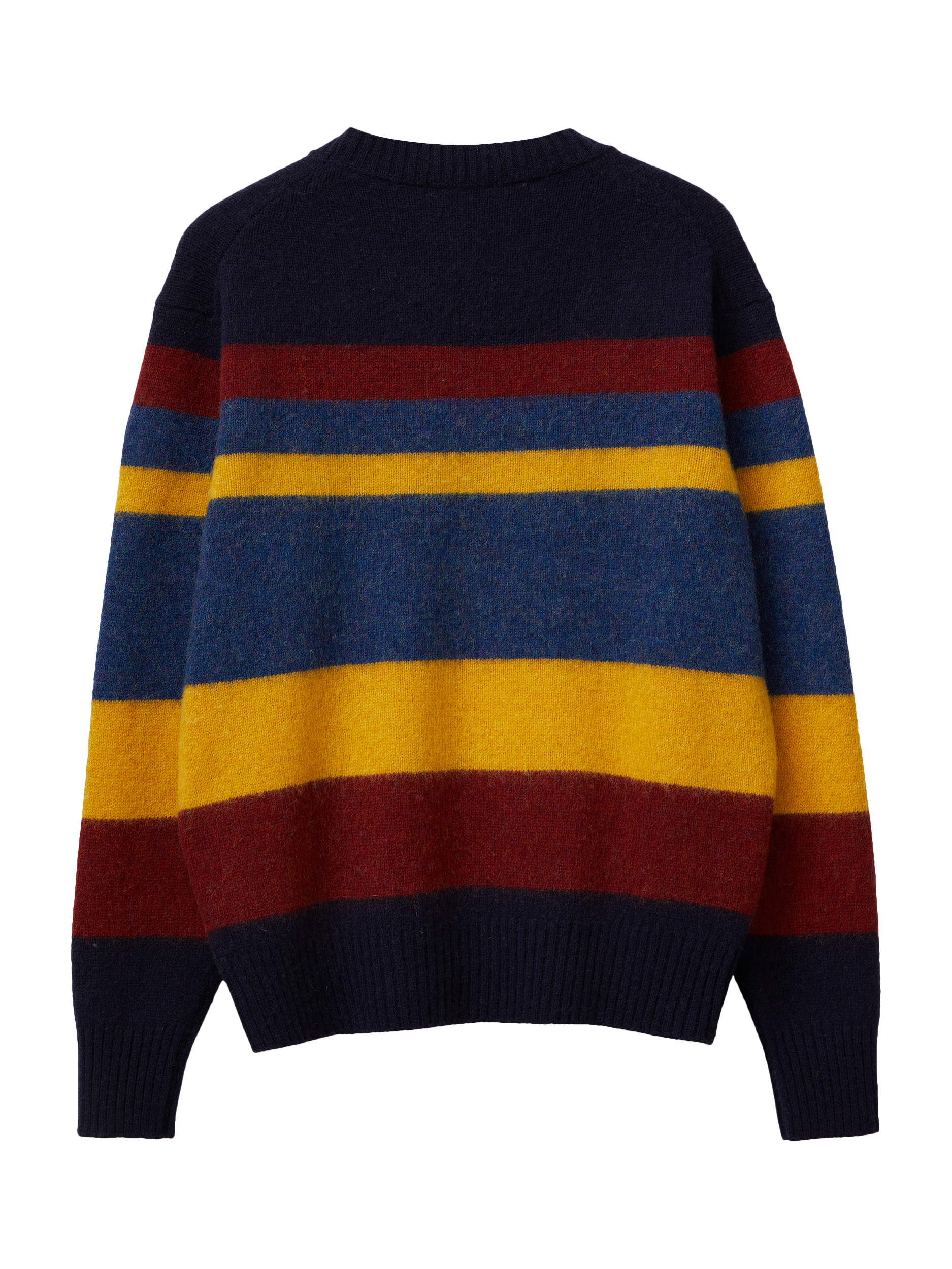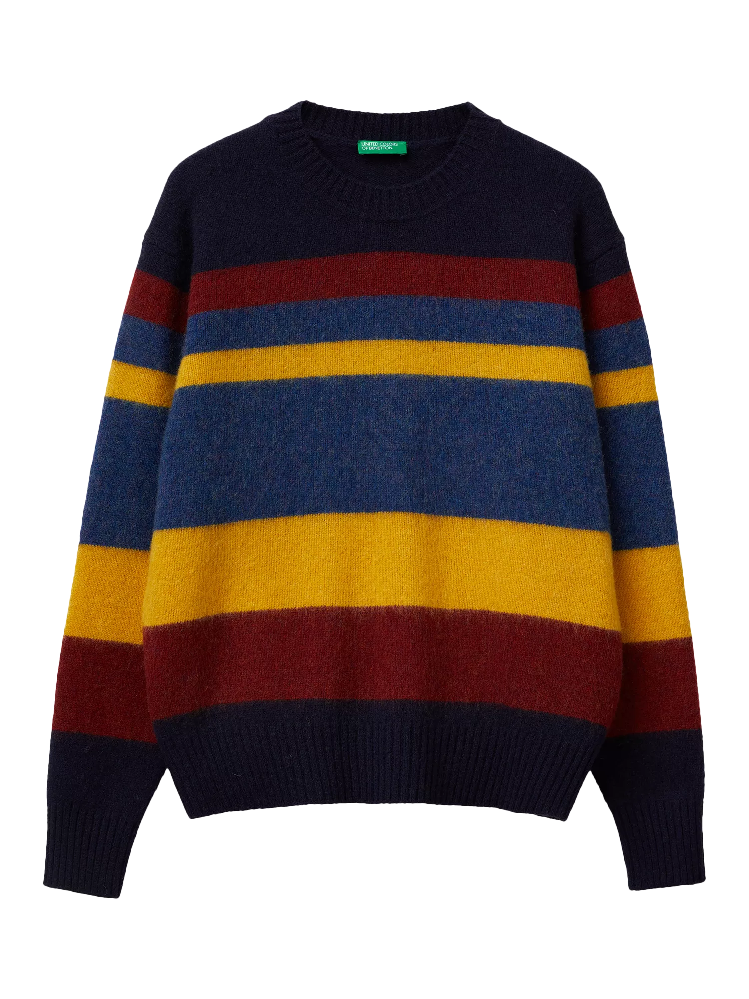This stylish brushed crewneck sweater offers a relaxed fit, perfect for layering. Featuring a striped knit and ribbed edges, it combines comfort with a vibrant pattern to enrich your wardrobe.