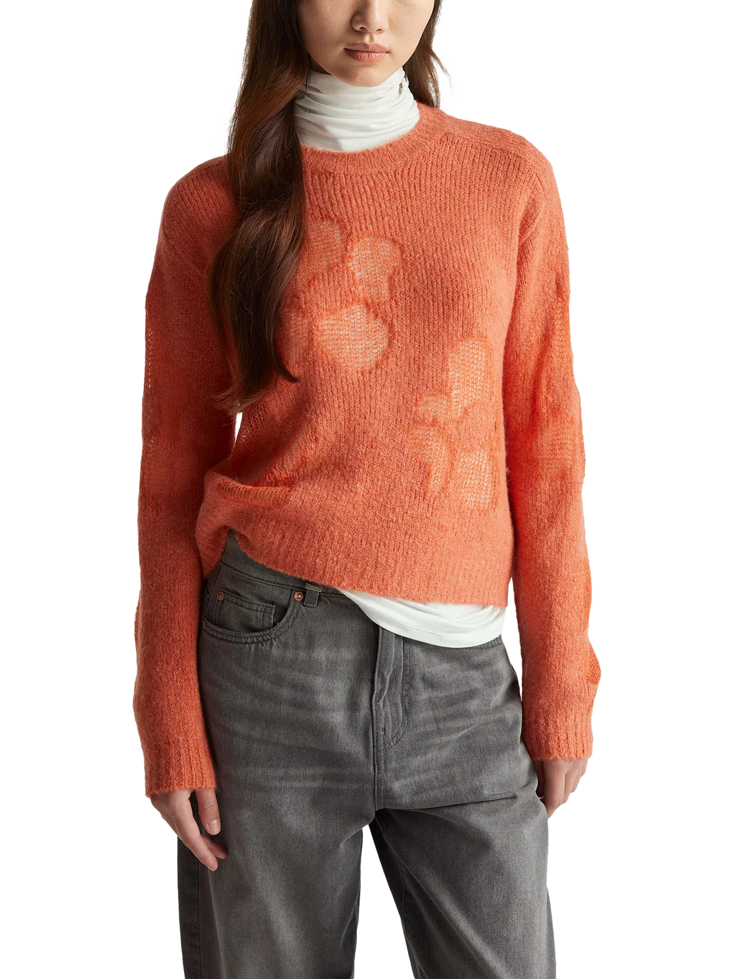 This stylish crew neck sweater features a loose fit with saddle shoulders and a soft brushed yarn, completed by a floral intarsia pattern.