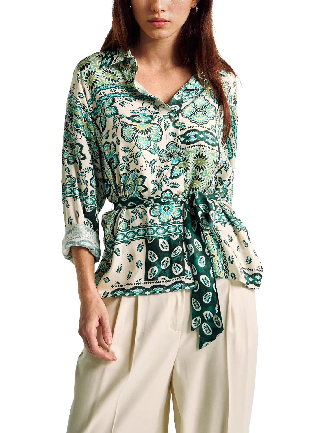 Elevate your casual wardrobe with this long-sleeved, floral-printed fluid viscose shirt featuring pleat details, a pointed collar, and a stylish waist belt.