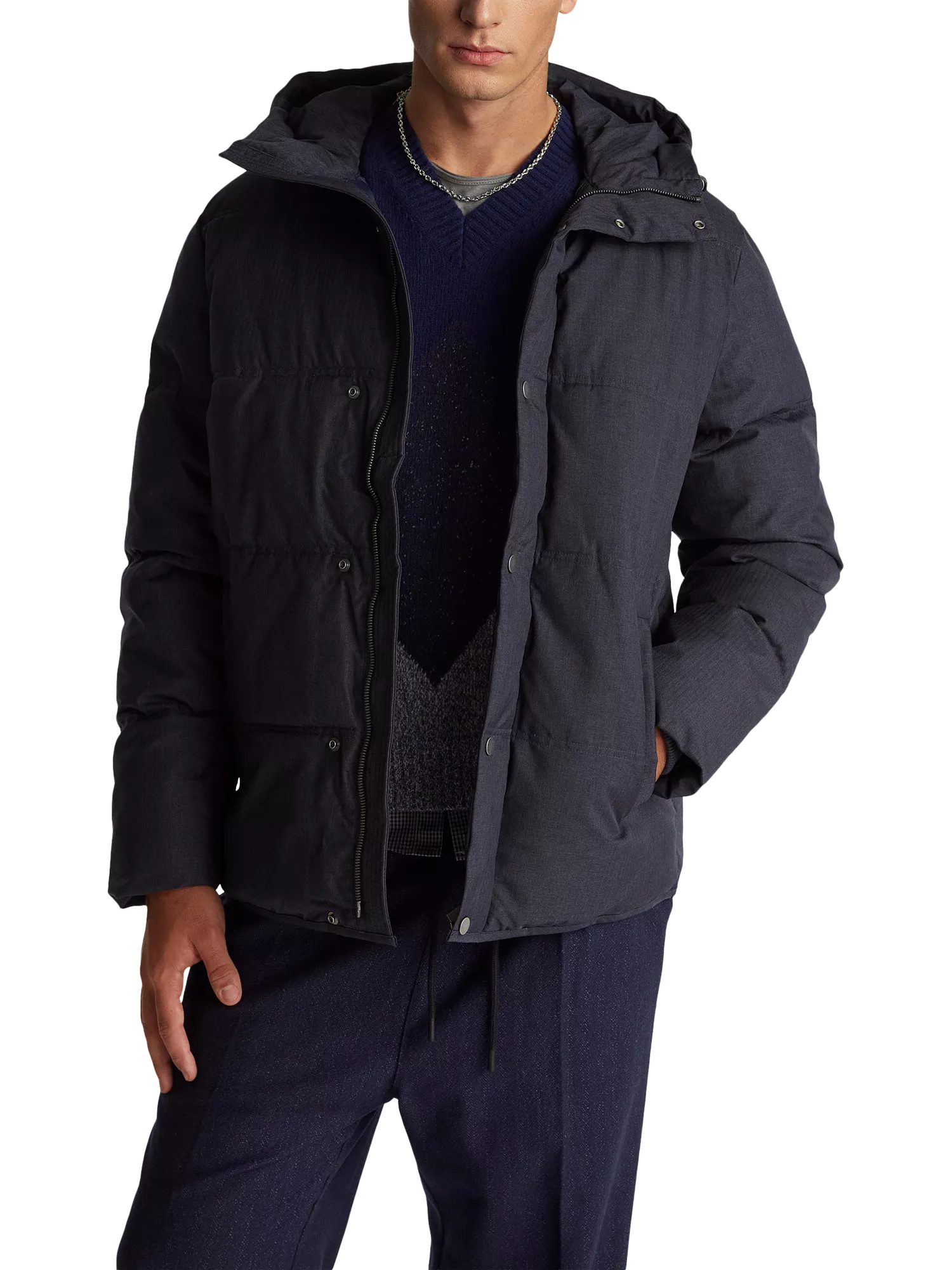 This plain down jacket is a versatile outerwear style that offers long-lasting comfort and warmth. It also comes complete with a convenient hood to ensure you are prepared for any weather-related eventuality.