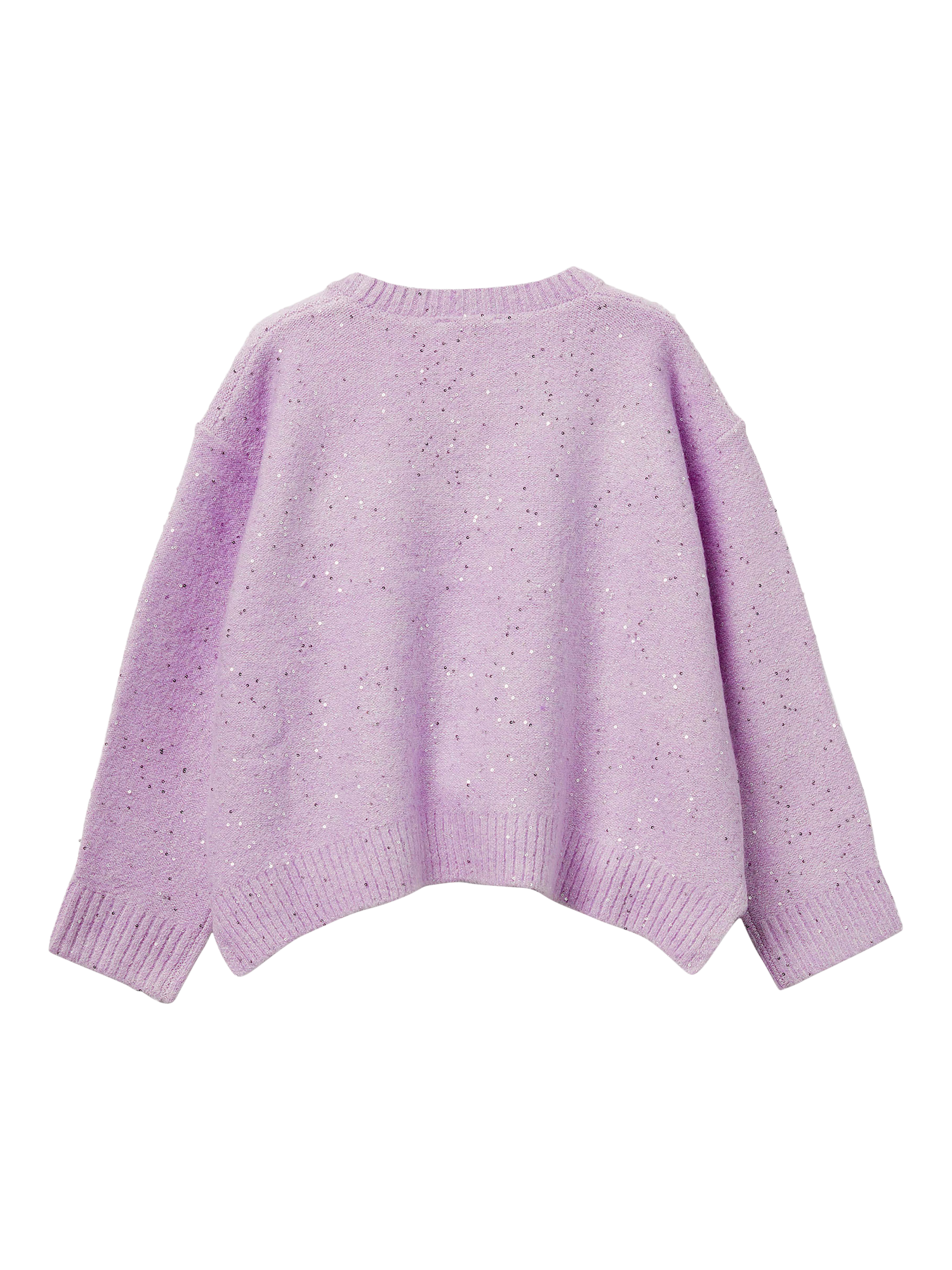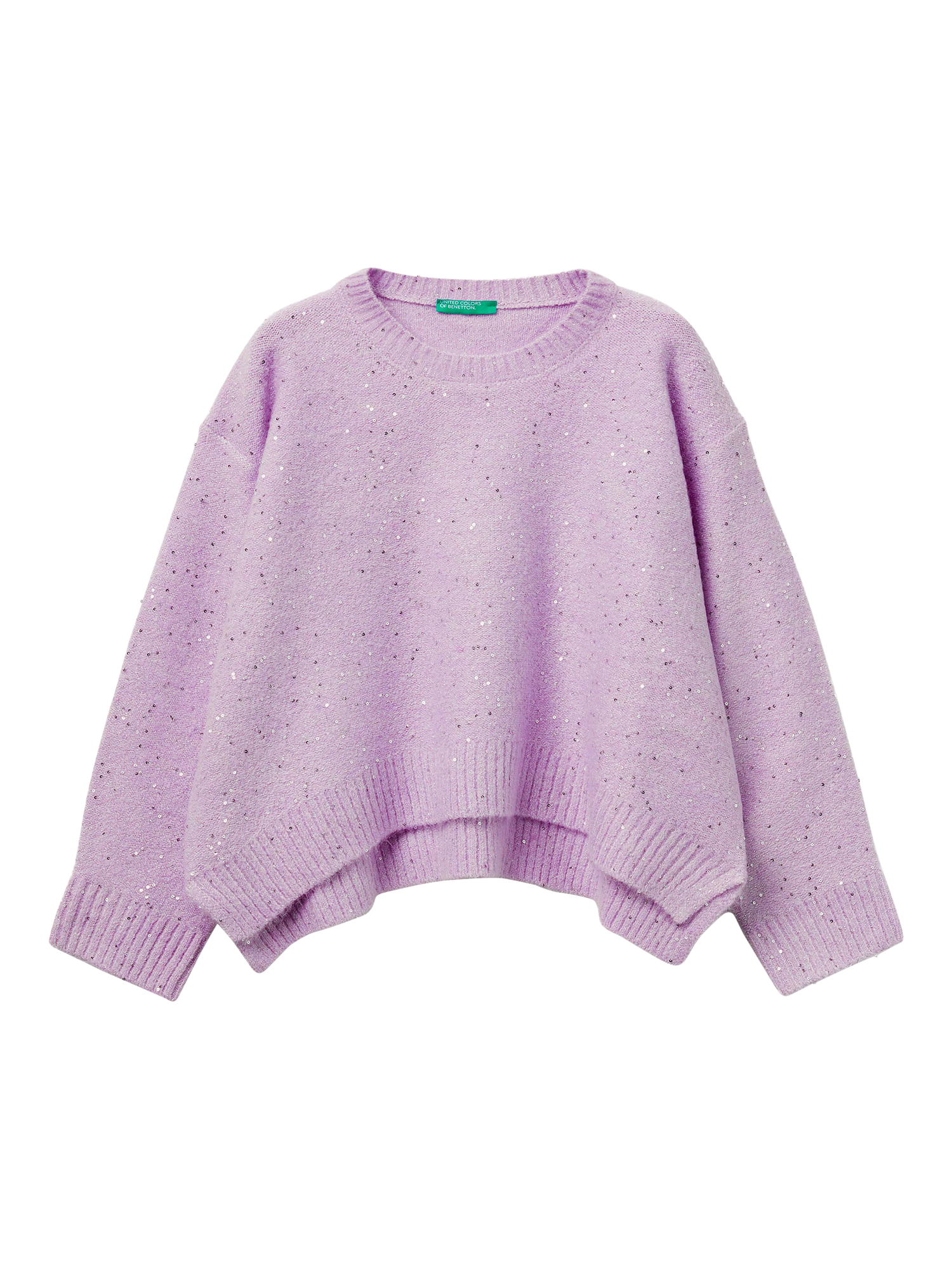 Elegant sweater in sequin yarn, featuring a trendy rounded hem, perfect for a casual yet chic ensemble.