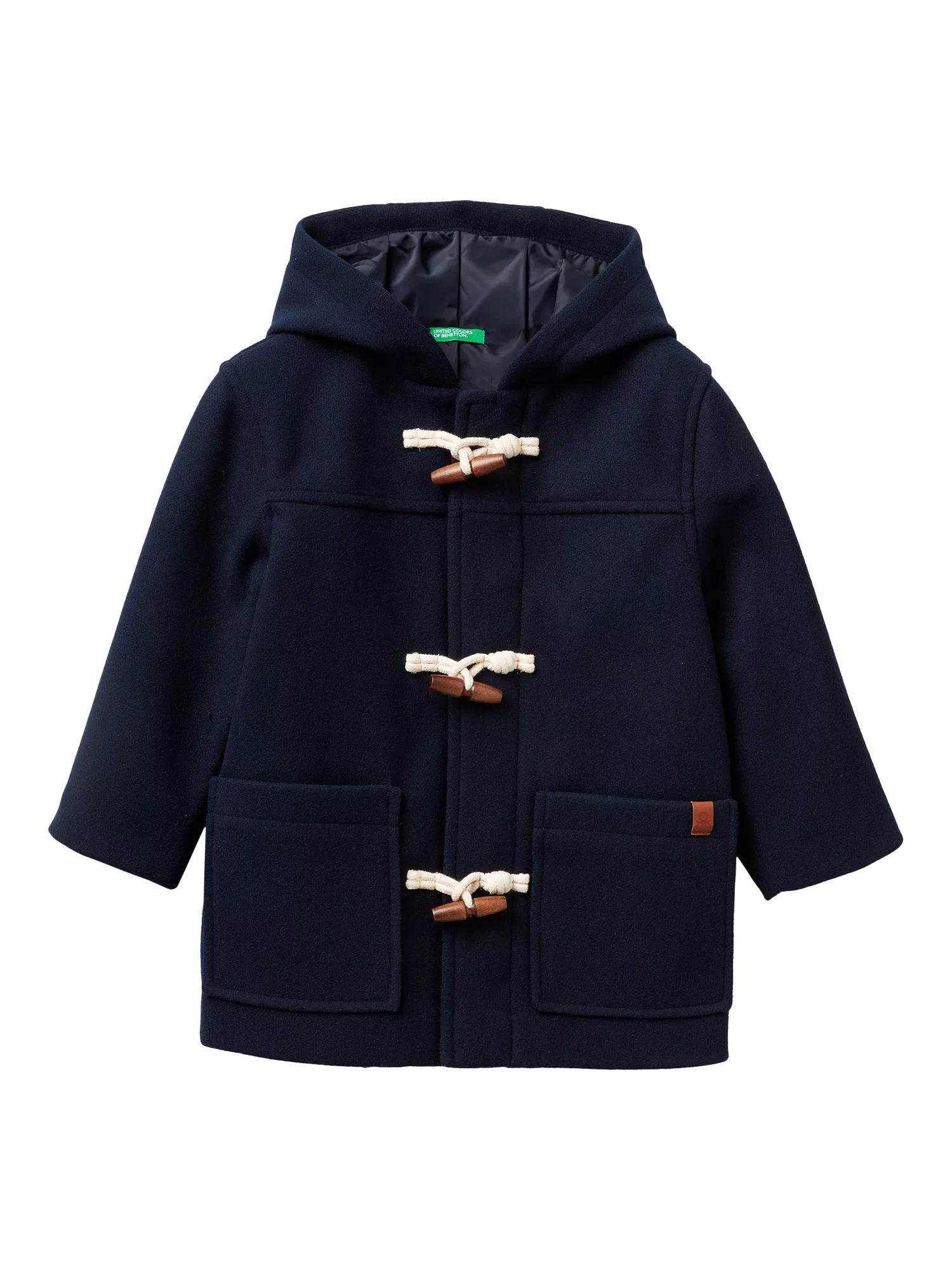 Wool-effect duffle coat with nylon lining. Secures with a zip and toggle fastening, featuring the brand's faux leather logo label.