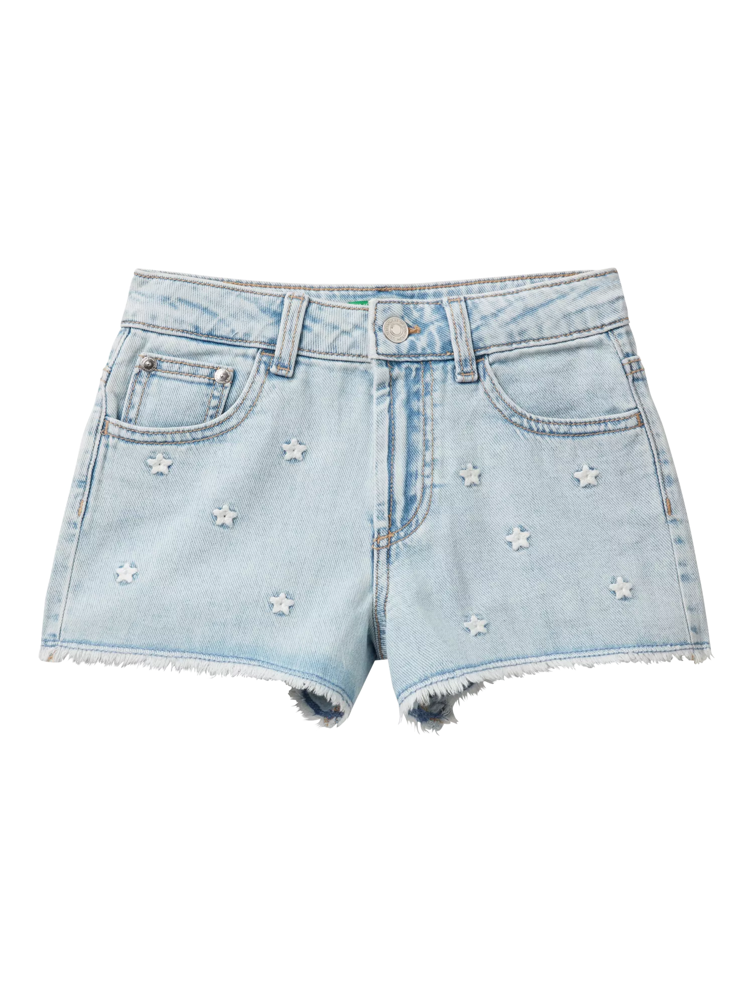 These soft denim shorts with a 5-pocket design and front embroidery offer versatile styles in light and medium wash shades. Made from a cotton and lyocell blend for comfort.