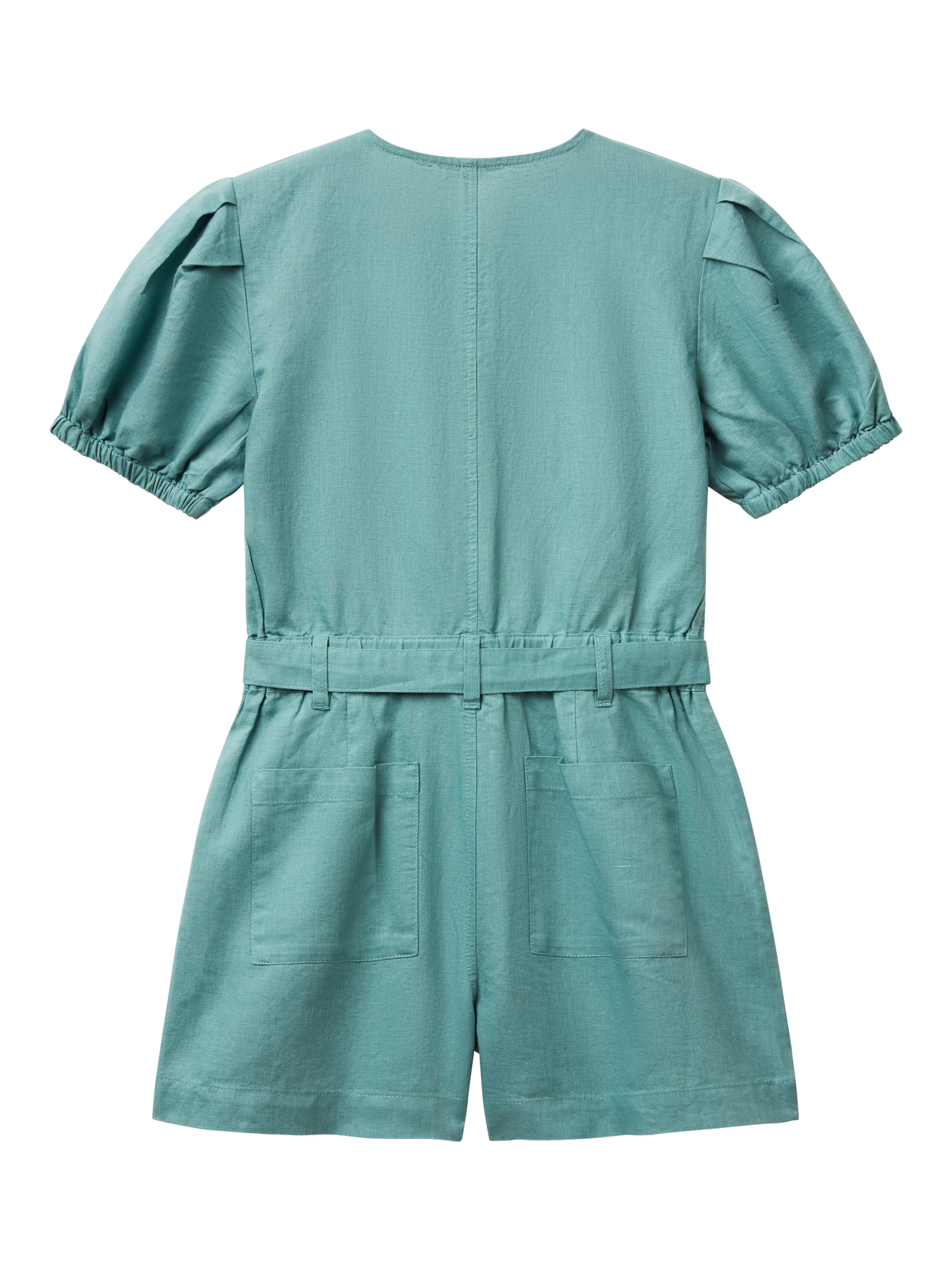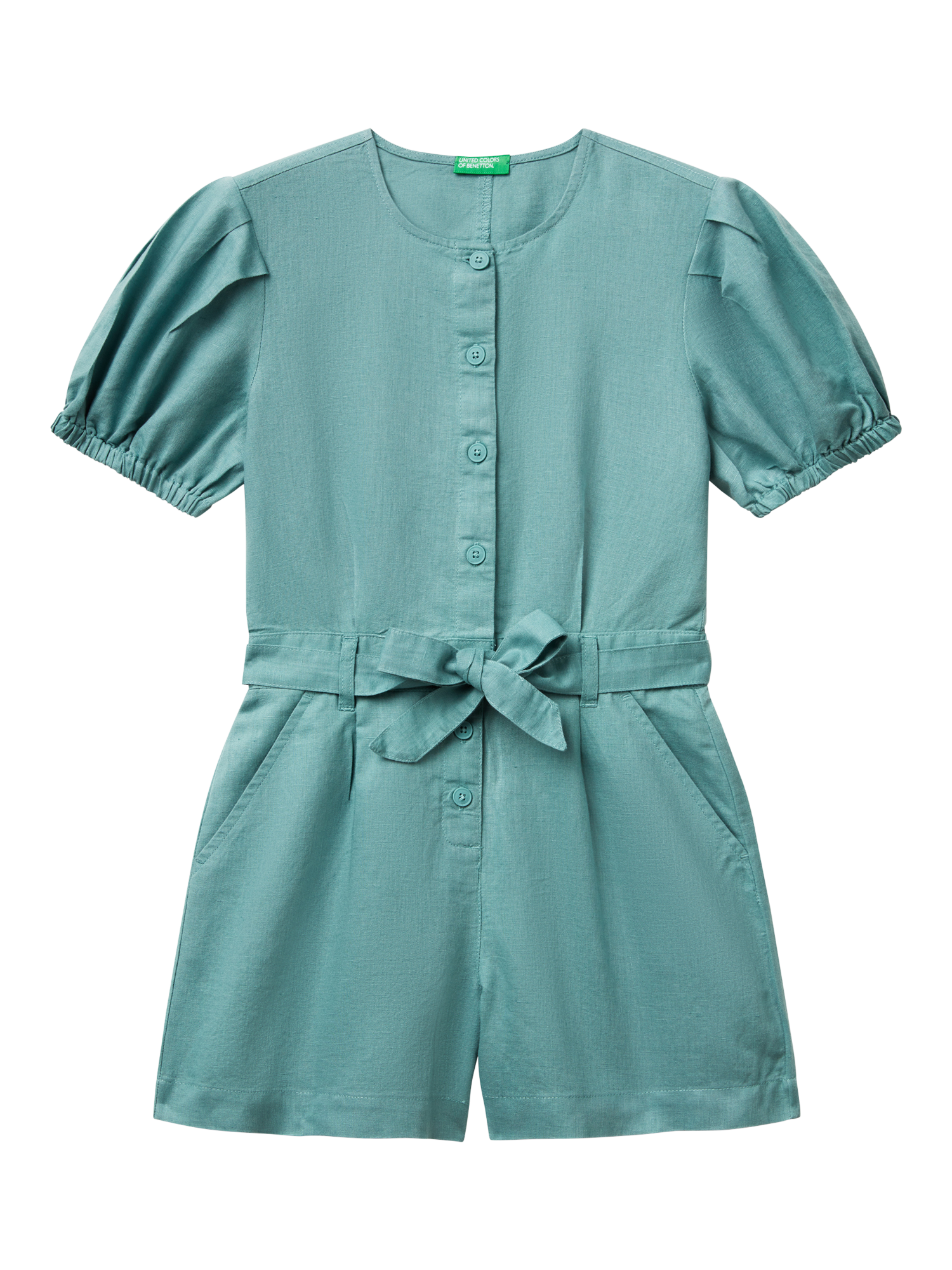 A trendy linen blend playsuit with front buttons and puff sleeves, featuring a waist sash and elasticated back for style and comfort.