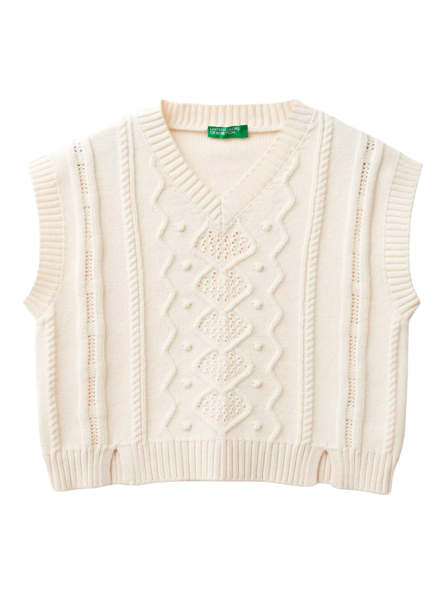 Wrap your little one in cosy comfort with this charming knitted vest from Benetton. Perfect for layering over shirts or long sleeves, this vest blends style with warmth, making it ideal for brisk days out or relaxing indoors.