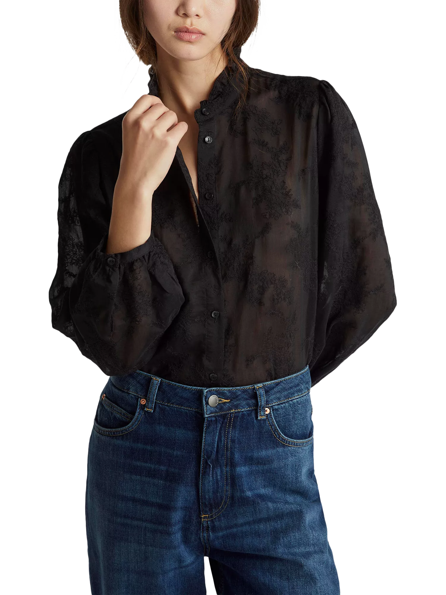 A stylish shirt with tone-on-tone embroidered fabric and a delicate mandarin collar with ruffles, perfect for casual occasions.