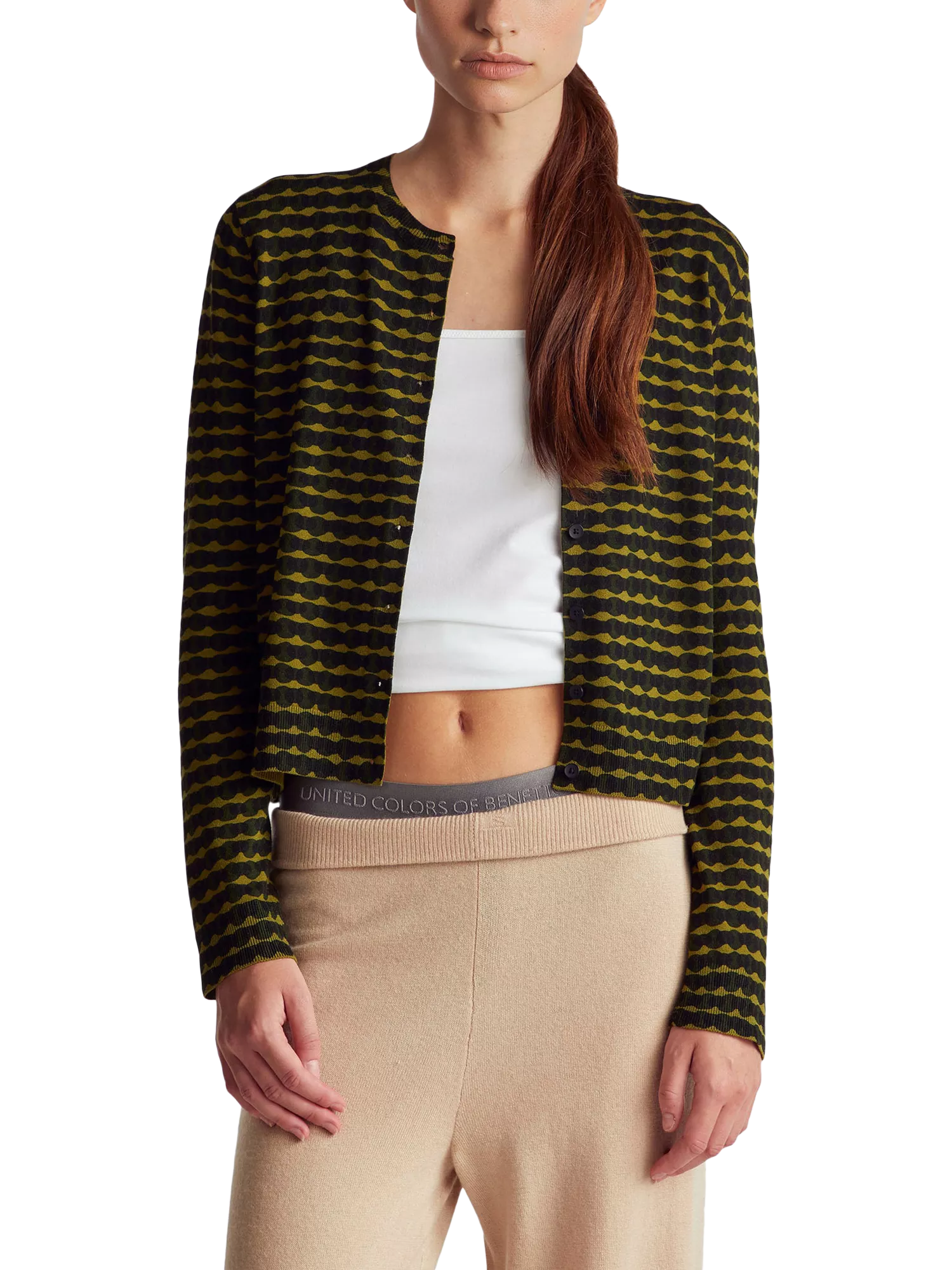 A wavy stripe round neck cardigan by Benetton. Its medium-weight knit keeps you comfortable, while the playful design adds interest. Ideal for layering season after season.