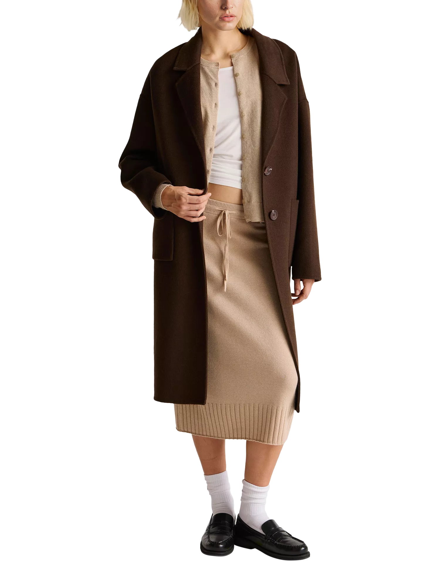 Luxurious wool blend long coat with dropped shoulders, a revere collar and practical patch pockets, perfect for a cosy winter look.