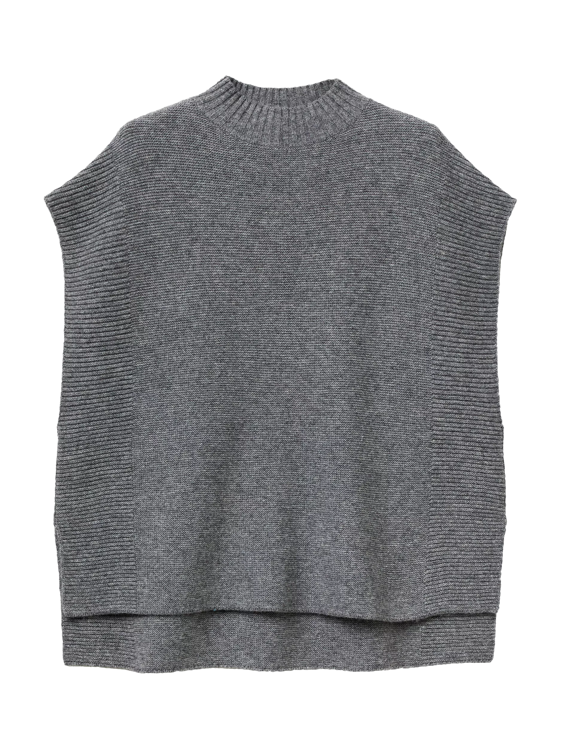 A rib knit mock turtleneck vest with a relaxed square fit, perfect for casual wear. Features side slits and a unique back length detail.