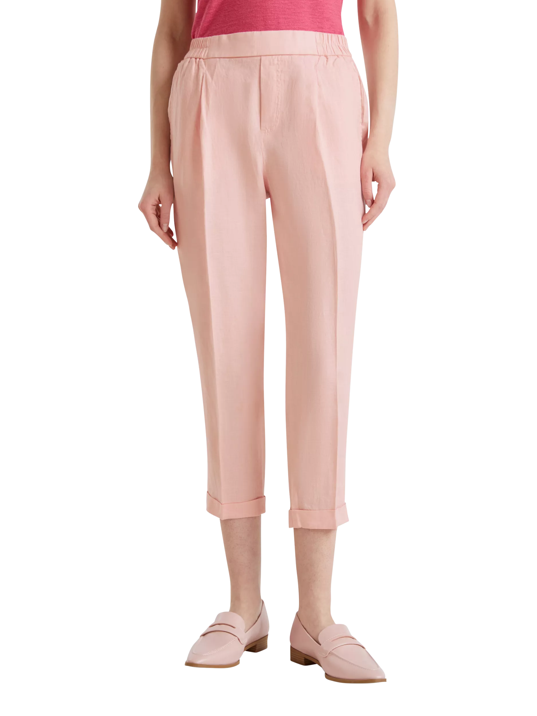 Straight, ankle length linen trousers with half-elastic waist, welted back pockets and a pleated front.